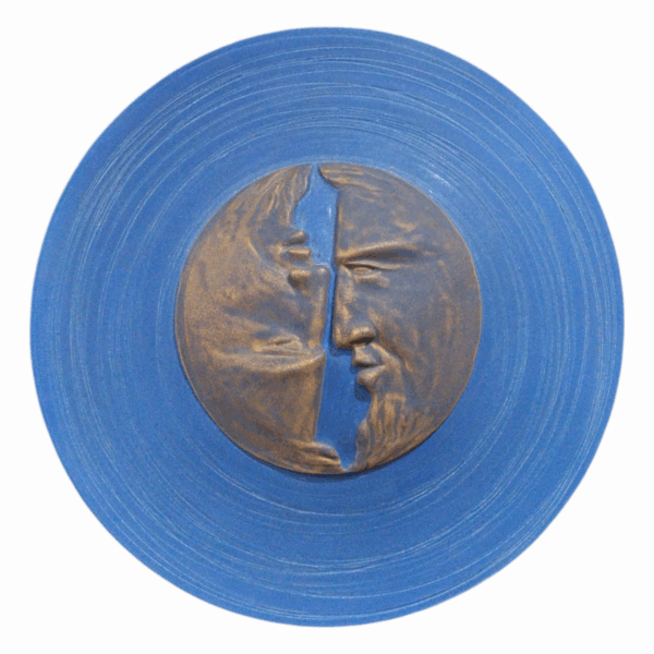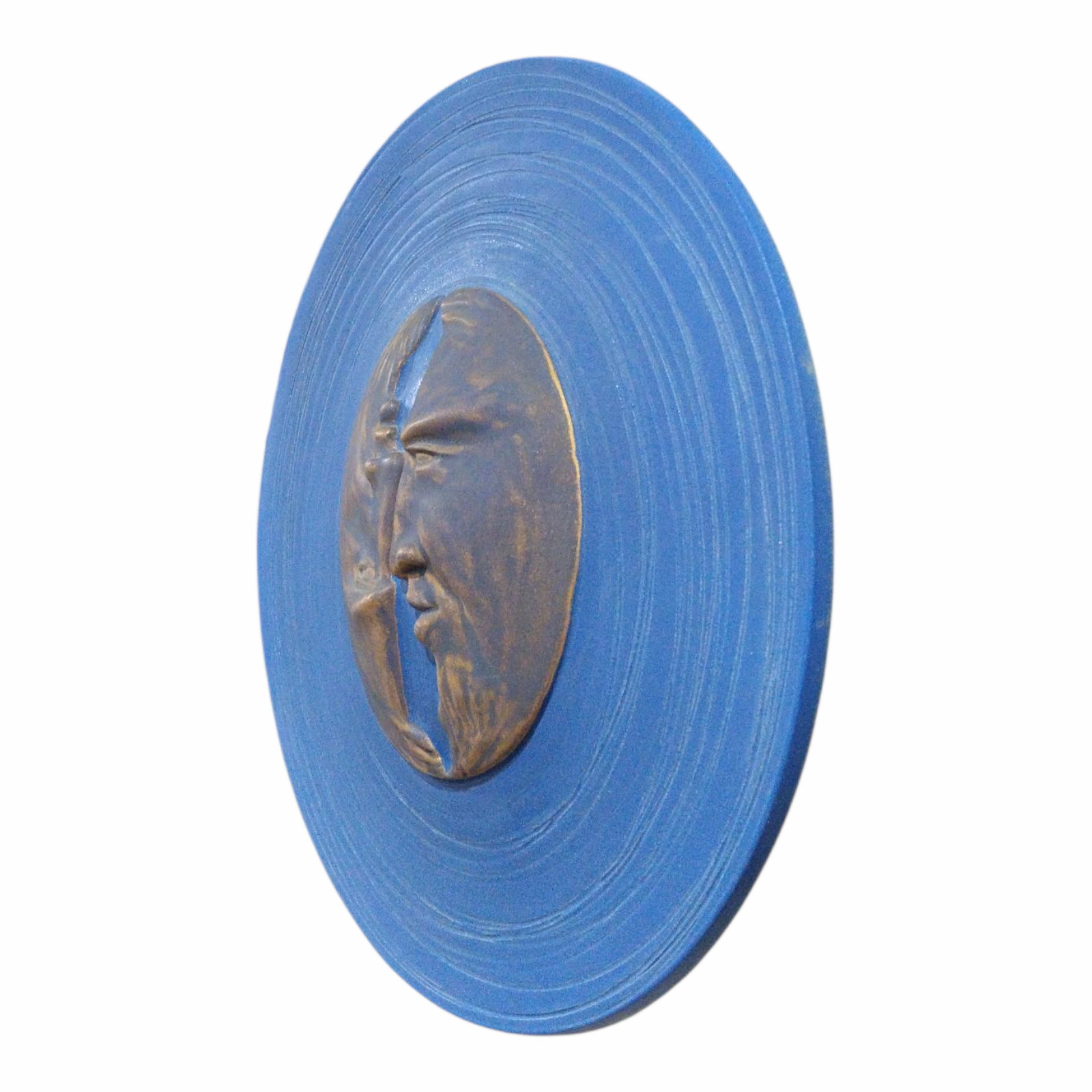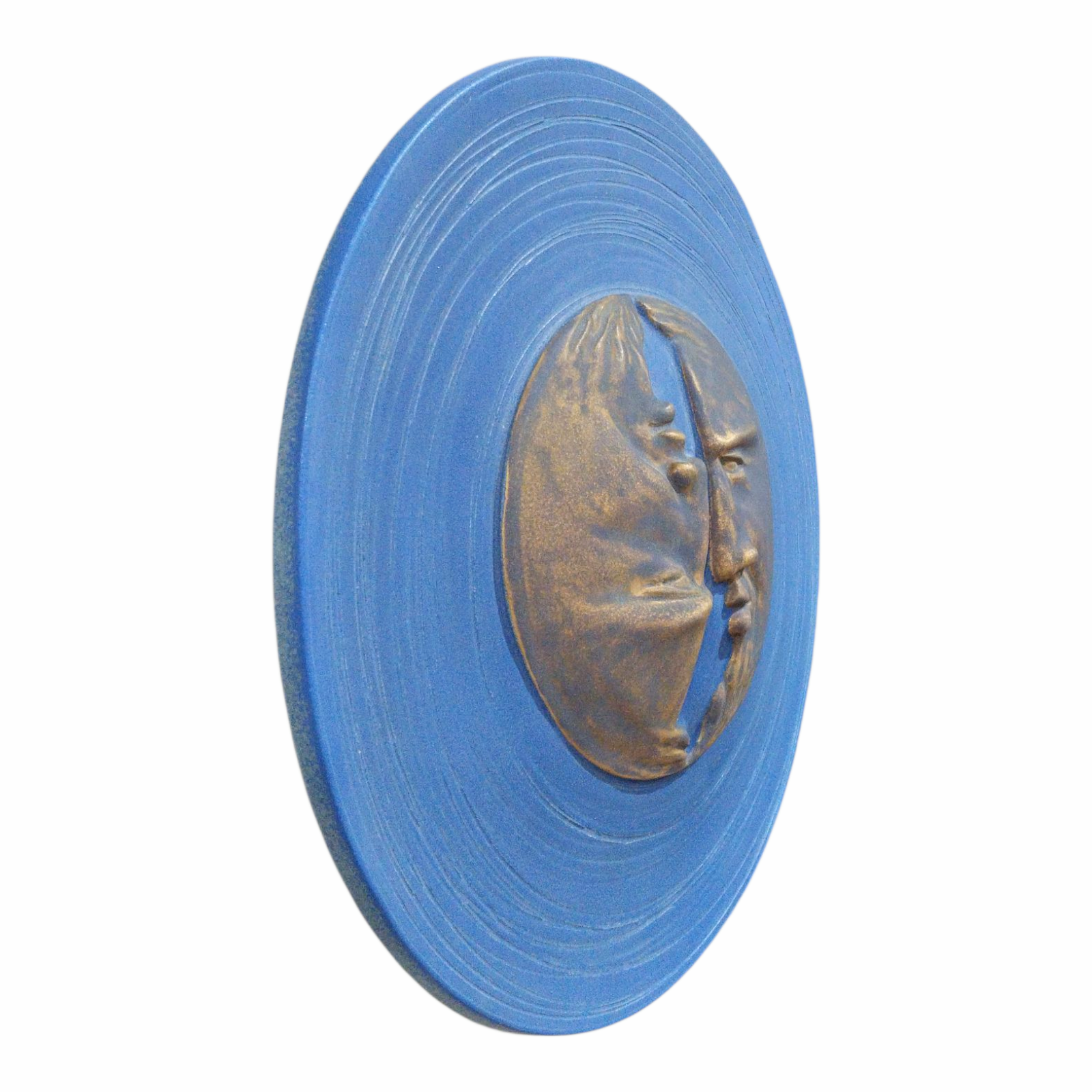 - This handcrfated ceramic wall piece combines contrast and elegance.Two gold crescent moon faces-one upright,one inverted-rest on a deep blue backround,encicled by fine engraved lines that echo their shapes.