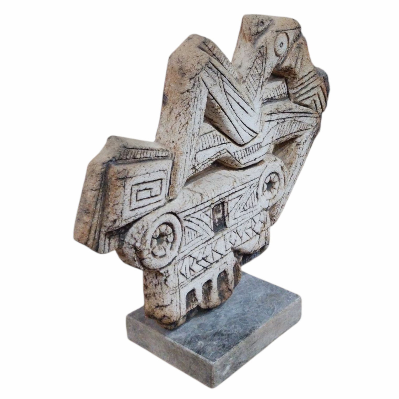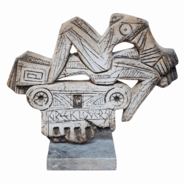 - ‘Greek Lovers’ presents a ceramic sculpture depicting two interconnected figures resting on a stylized column,handcrafted in warm earthy tones that enhance its natural,organic character.Resting on a marble base,the sculpture offers a sense of stability and contrast to the fluid ceramic forms above.The piece subtly explores intimacy and connection through abstract geometry and engraved textures,merging classical inspiration with a contemporary artistic approach.