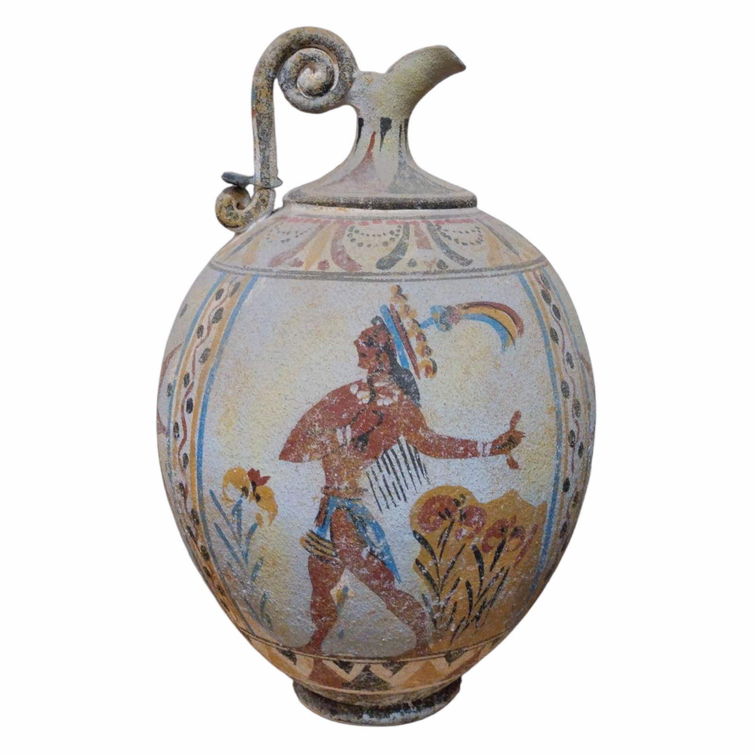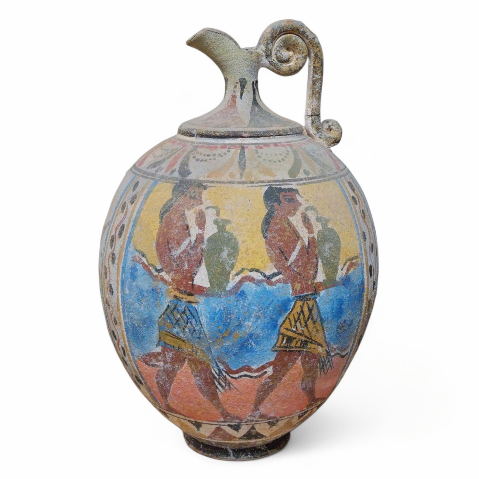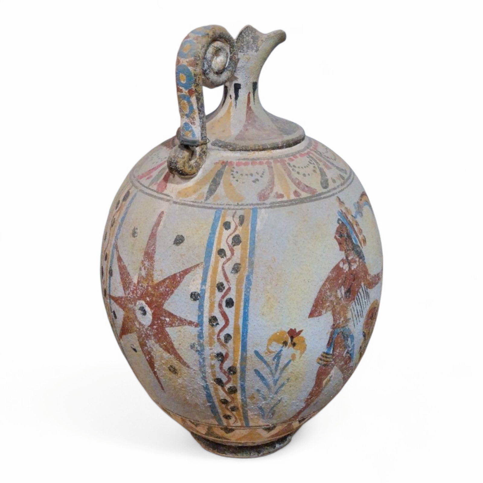 Minoan-Style Hand-painted Ceramic Vase with Warrior and Procession Motifs