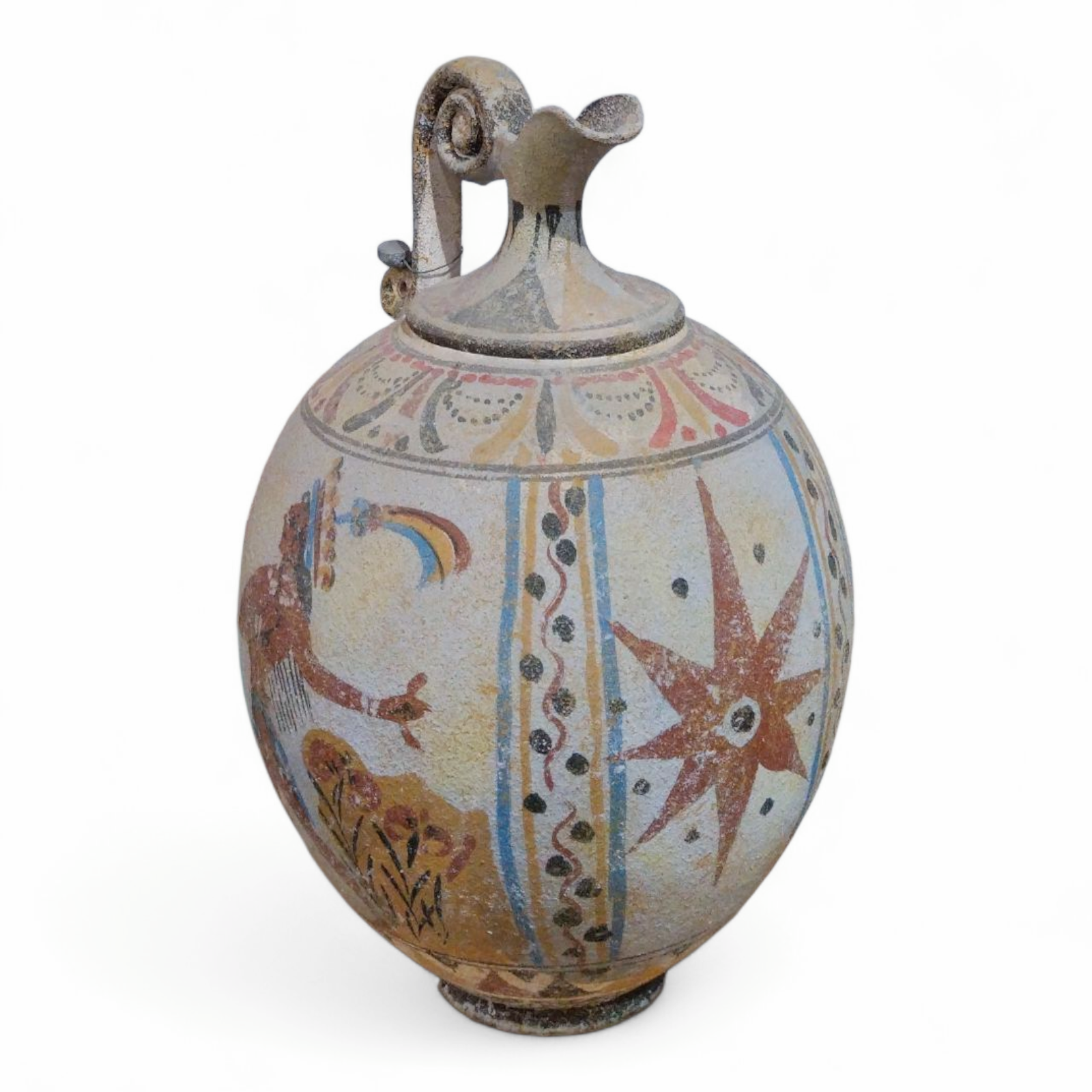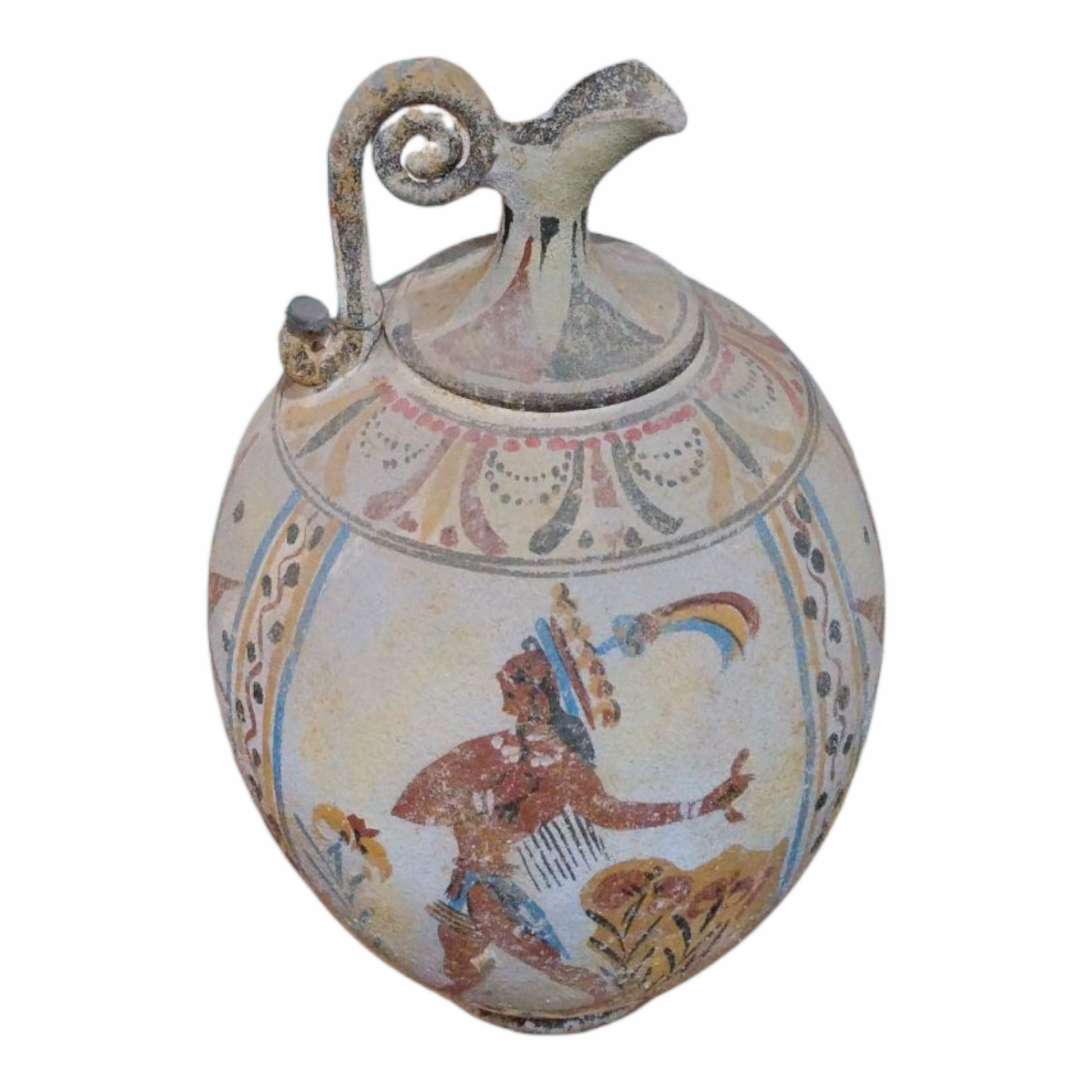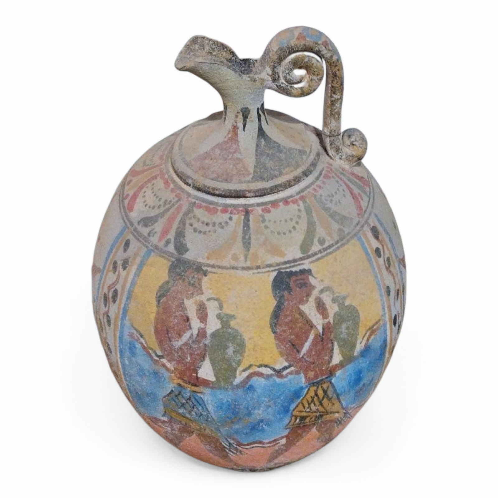 Minoan-Style Hand-painted Ceramic Vase with Warrior and Procession Motifs
