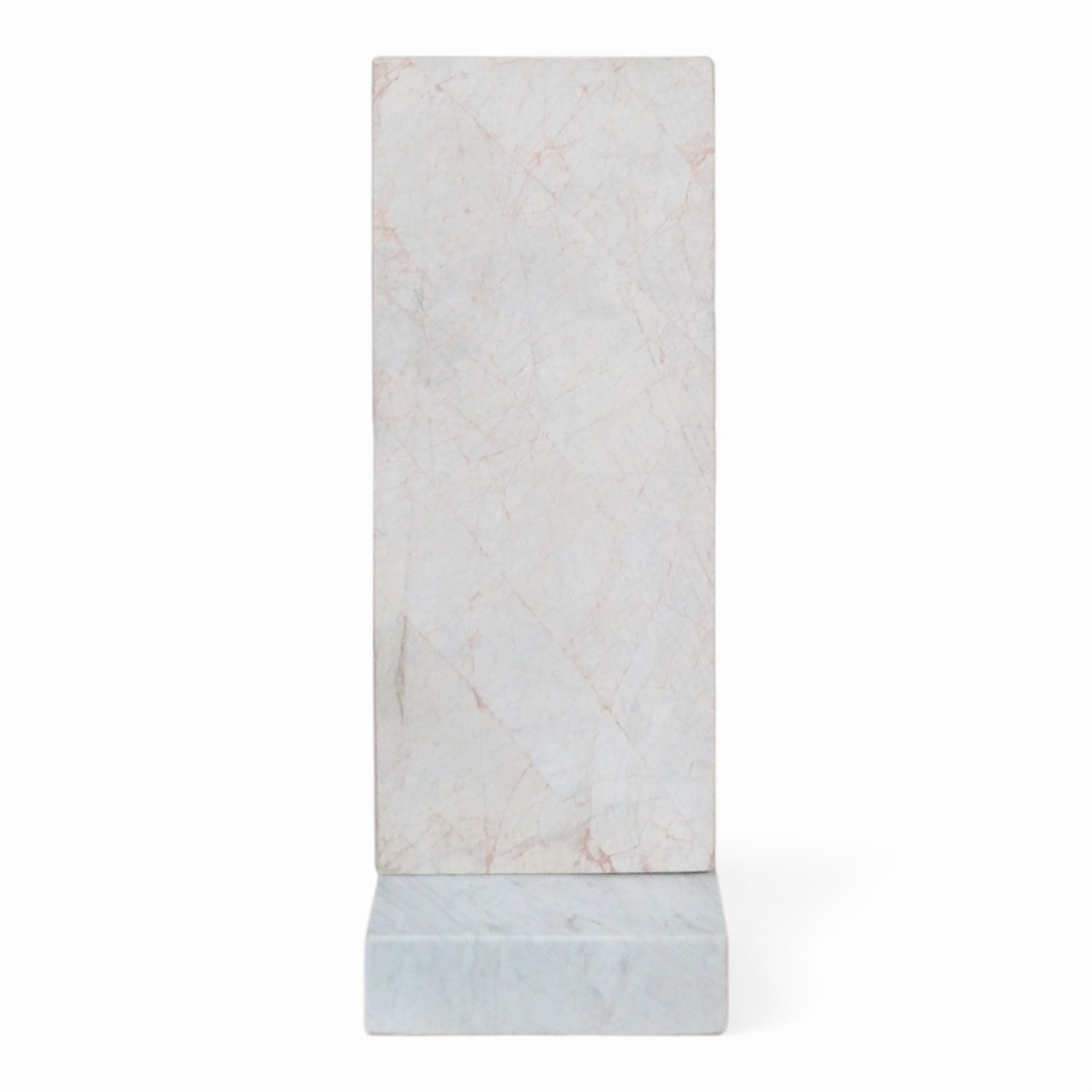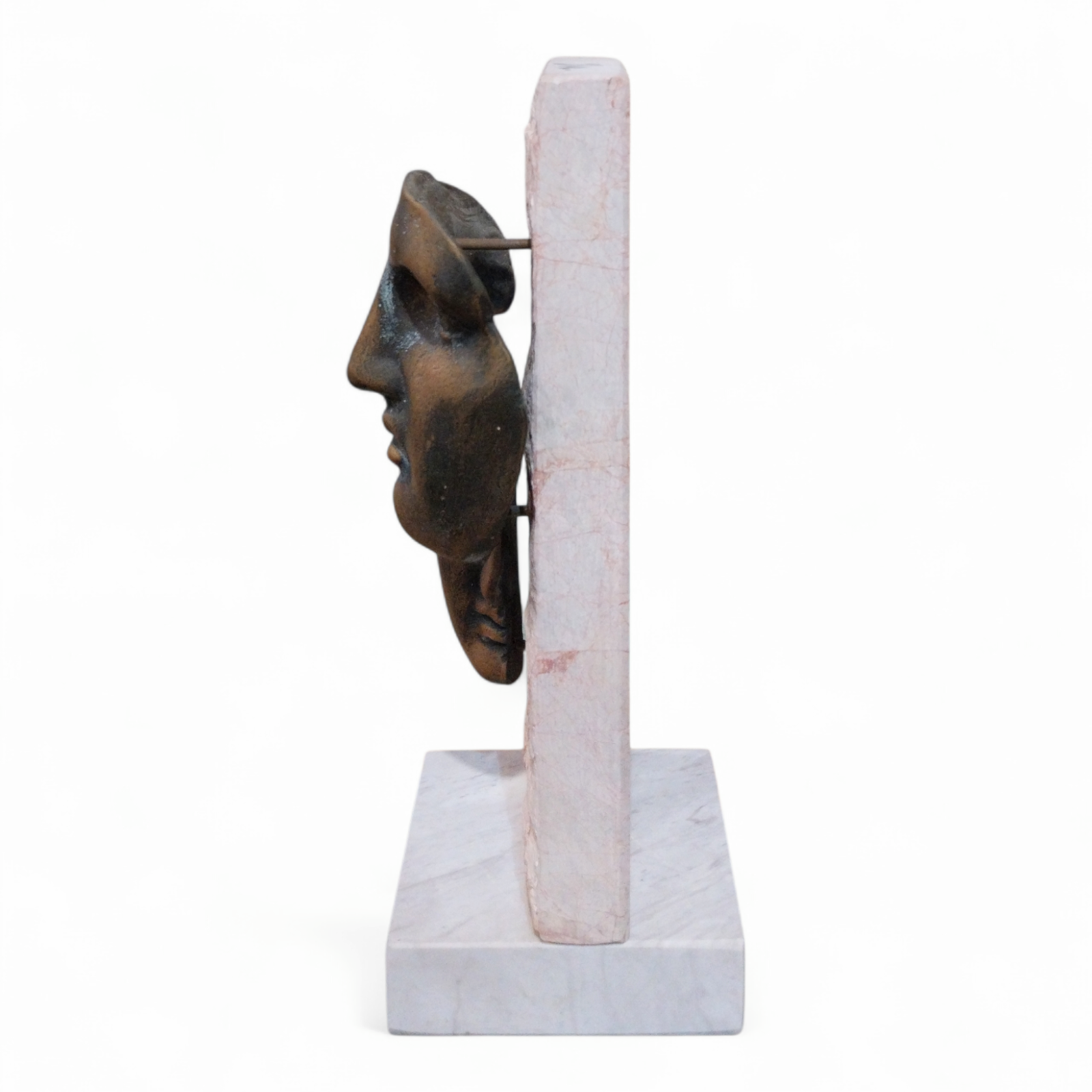- The bronze faces are mounted on a solid marble back slab with a rough,textured surface,while the entire sculpture rests on a smooth and equally solid marble base,creating a subtle contrast of textures and a feeling of stability.