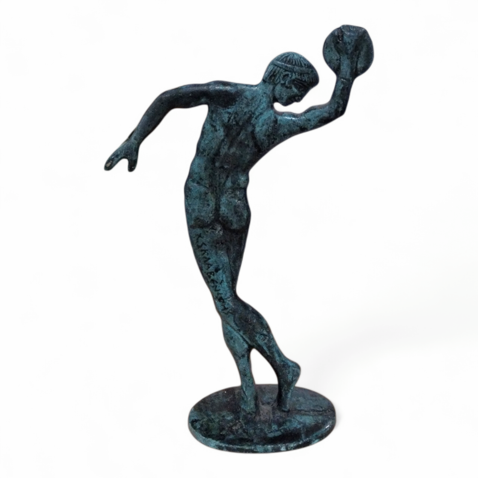 - This small-sized bronze sculpture of a discus thrower captures the moment just before release,highlighting balance,tension,and controlled movement.