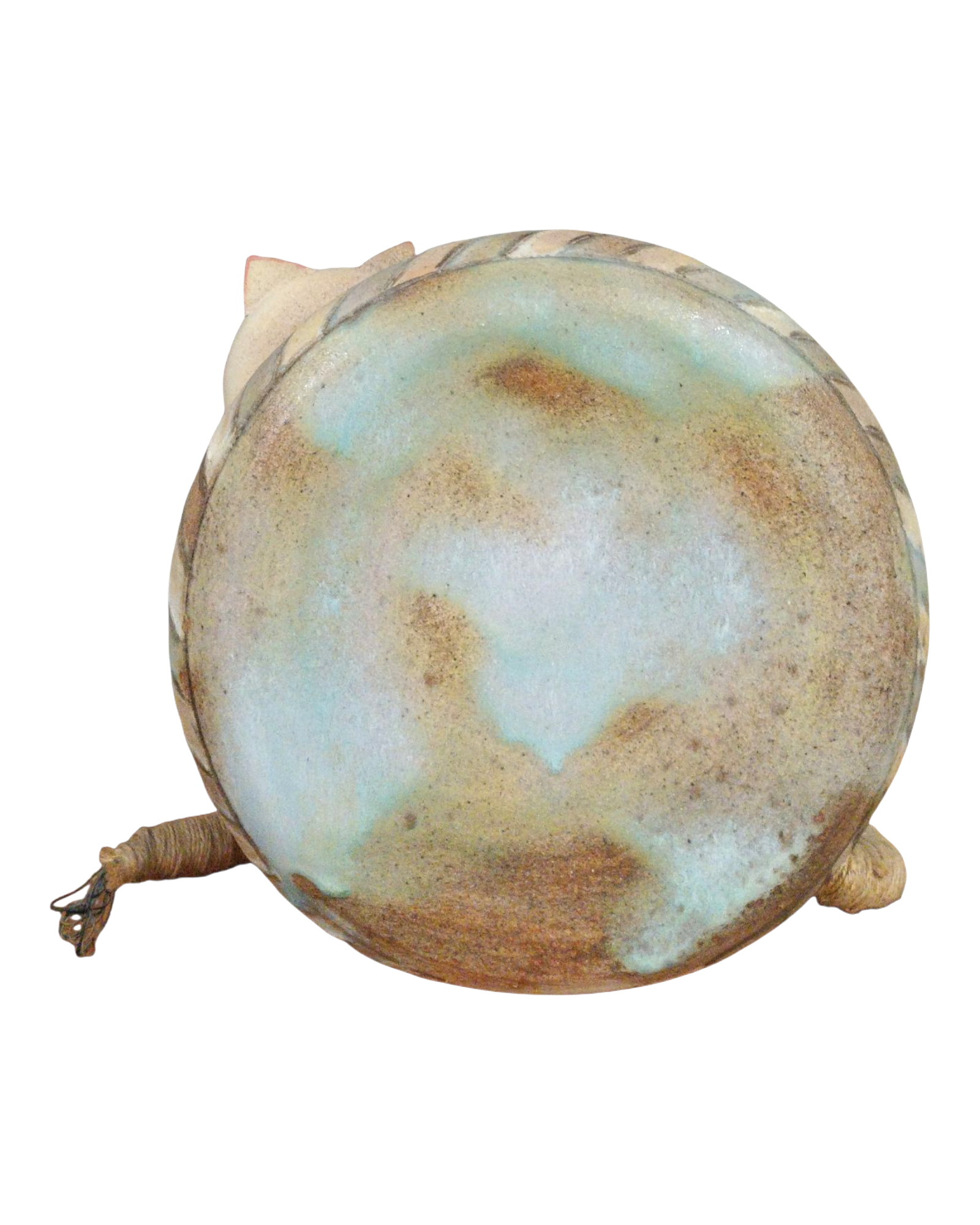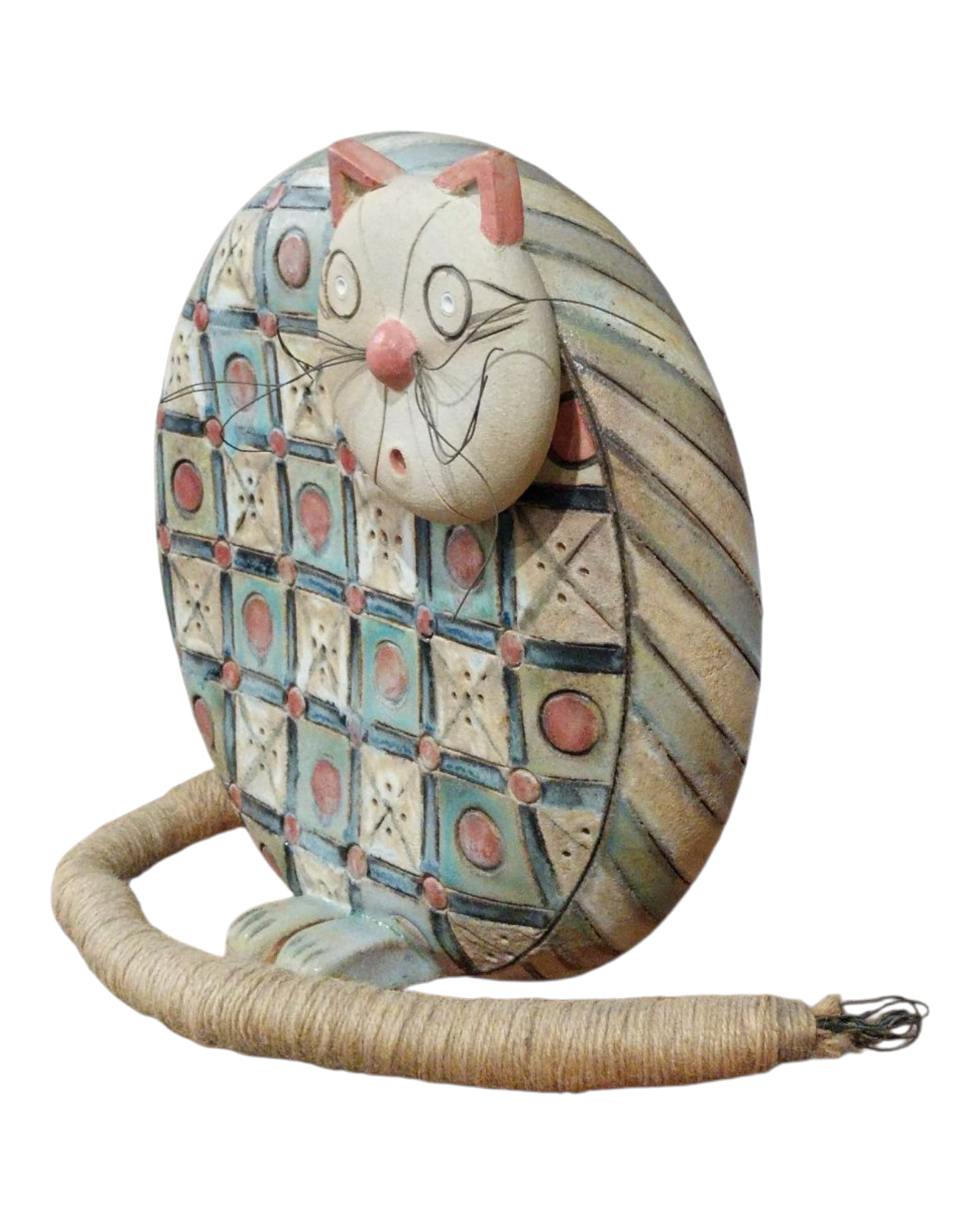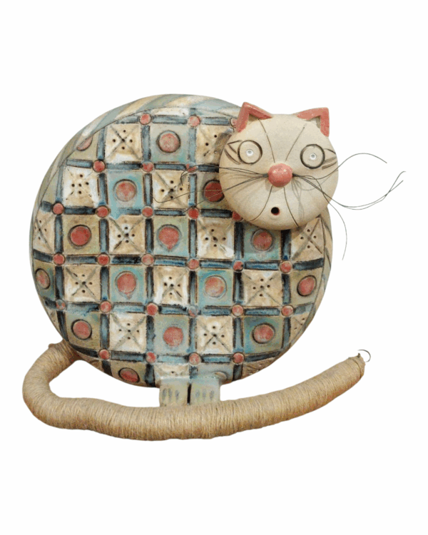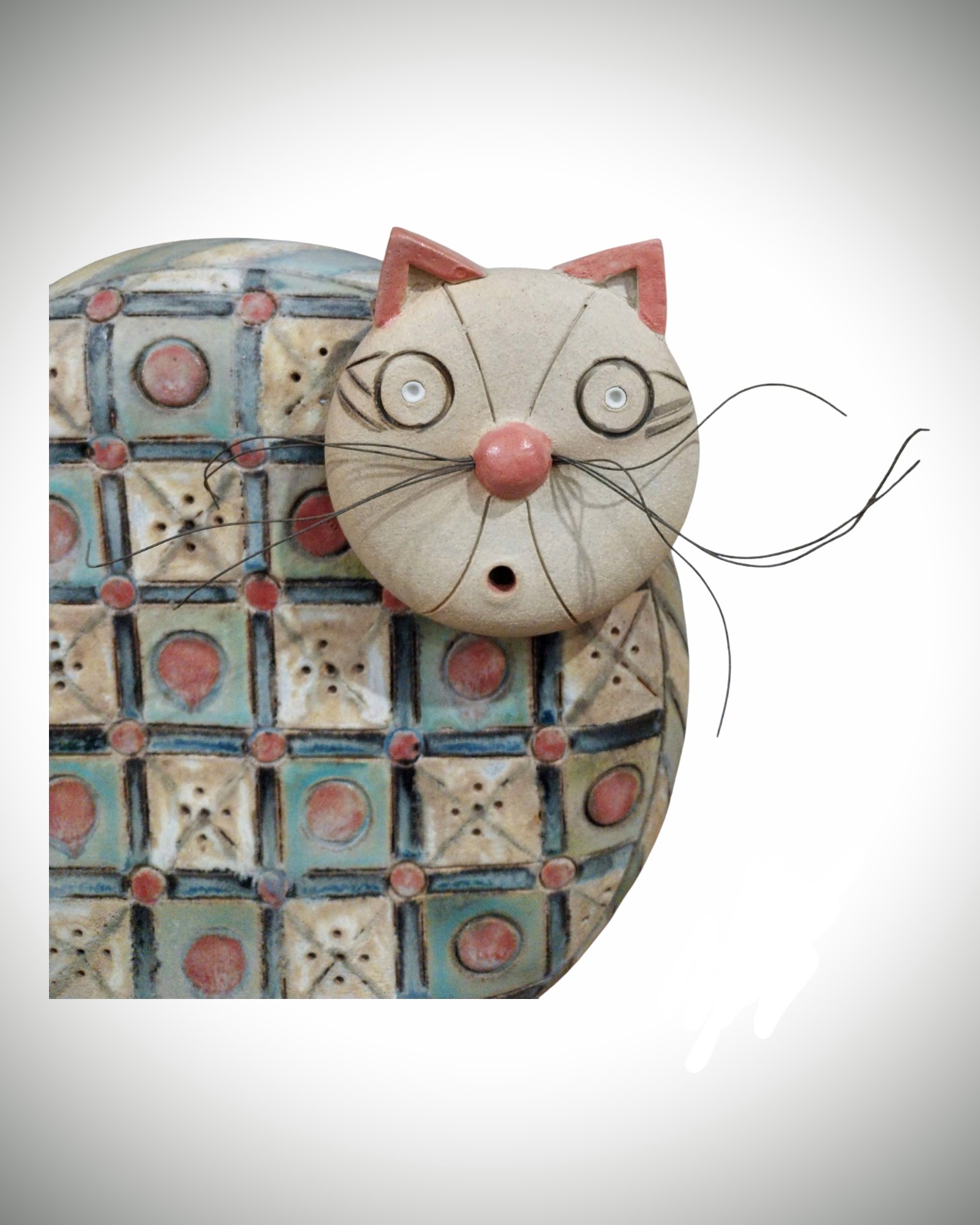 • Geometric Harmony  is an artisan ceramic cat sculpture that blends playful charm with refined craftmanship.Its circular body is decorated with an intricate geometric mosaic,while the expressive face and curved tail add warmth and personality.