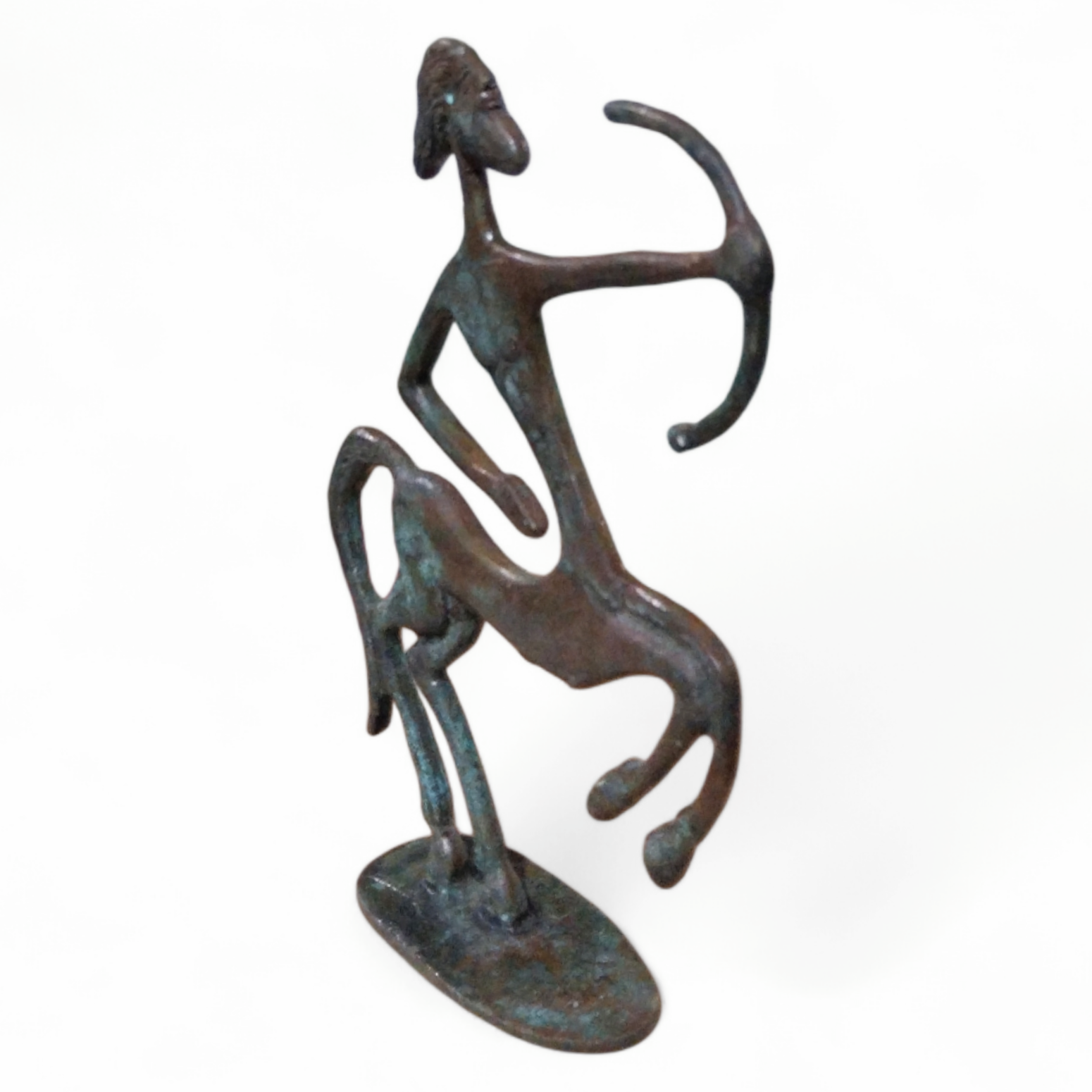 • This bronze centaur sculpture portrays the mythical half-man,half-horse figure holding a bow,a symbol of strength,agility,and harmony between intellect and instinct.