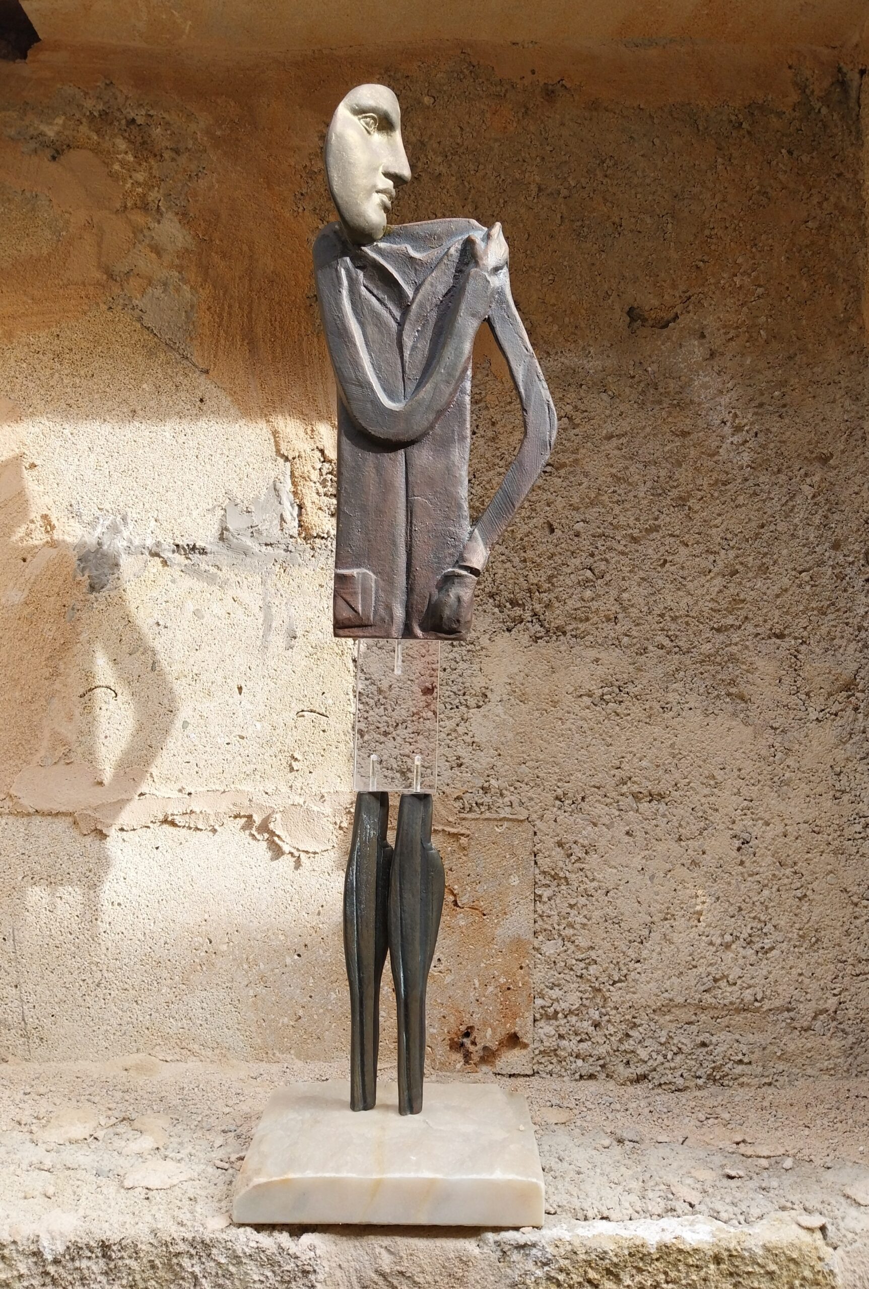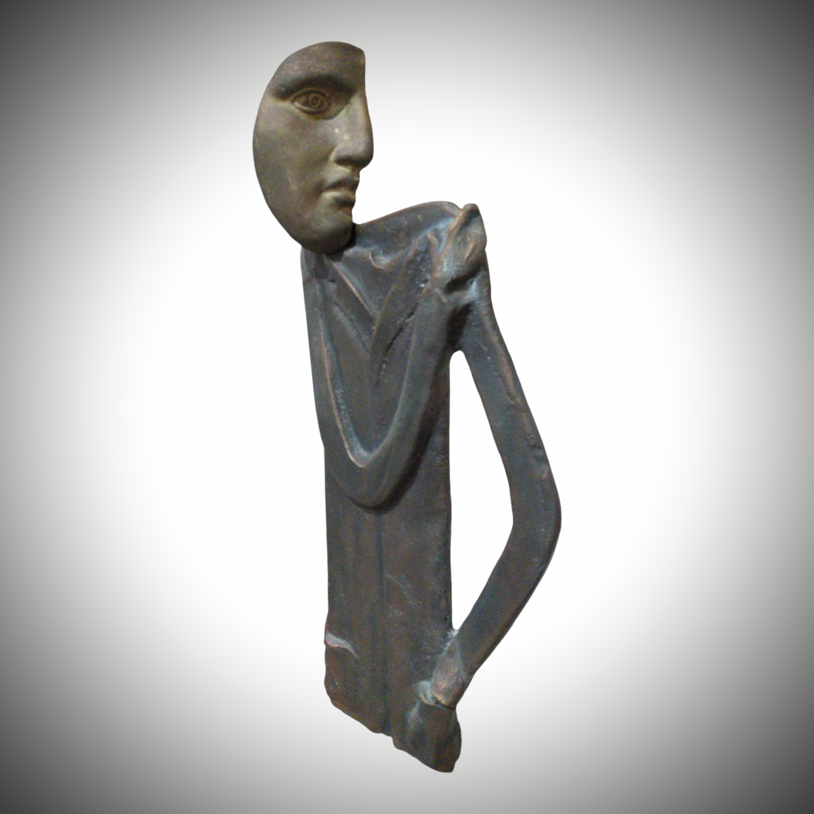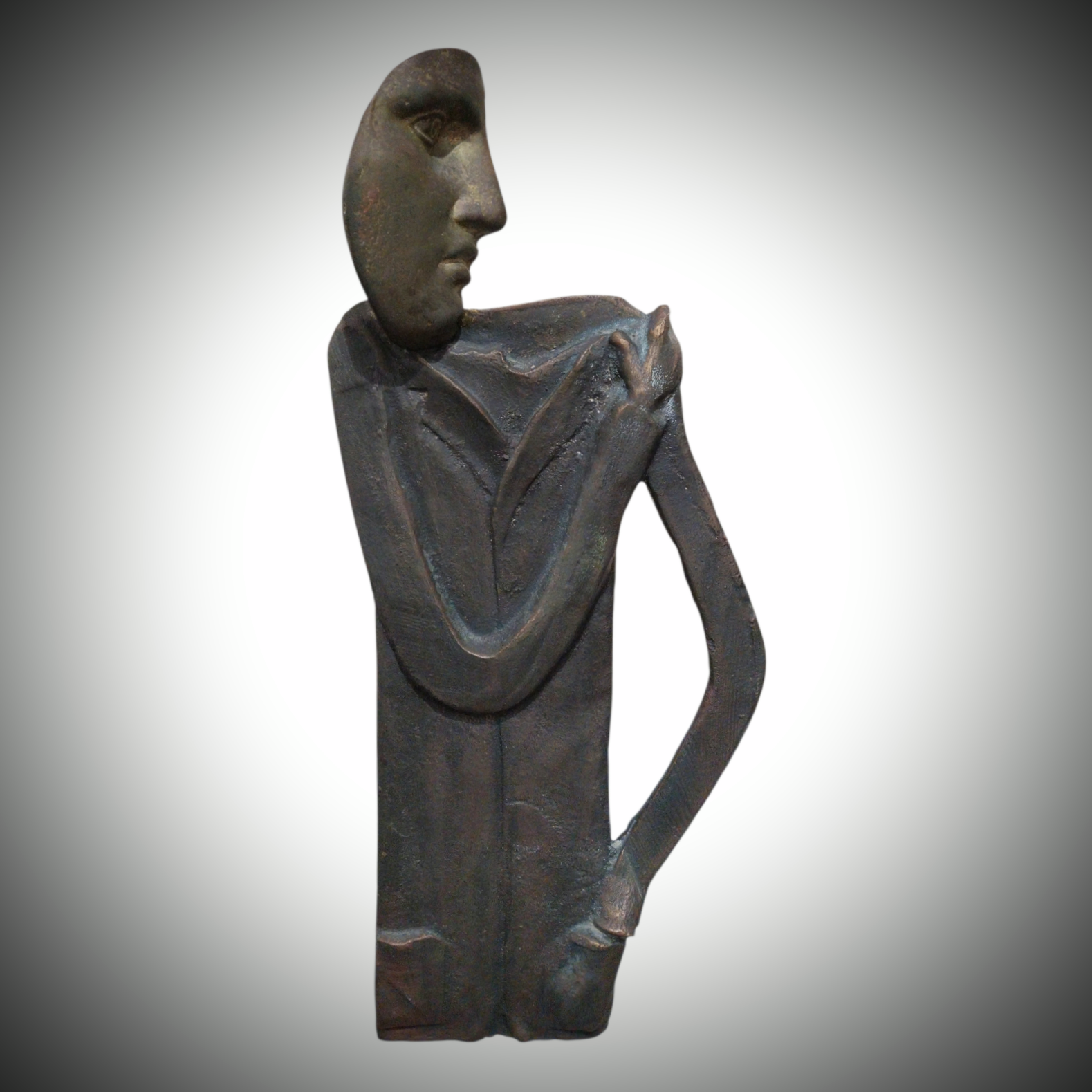 - This contemporary bronze sculpture depicts a male figure standing in a state of quiet introspection.Mounted on a solid marble base,the figure’s legs and torso are subtly connected through transparent plexiglass elements,creating a sense of suspension and structural tension.