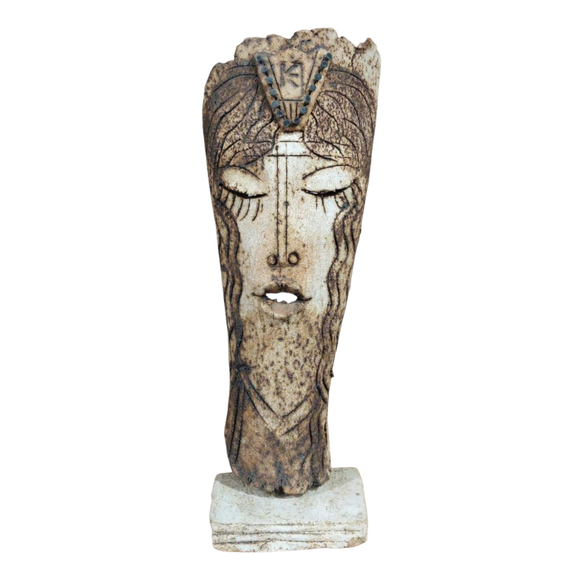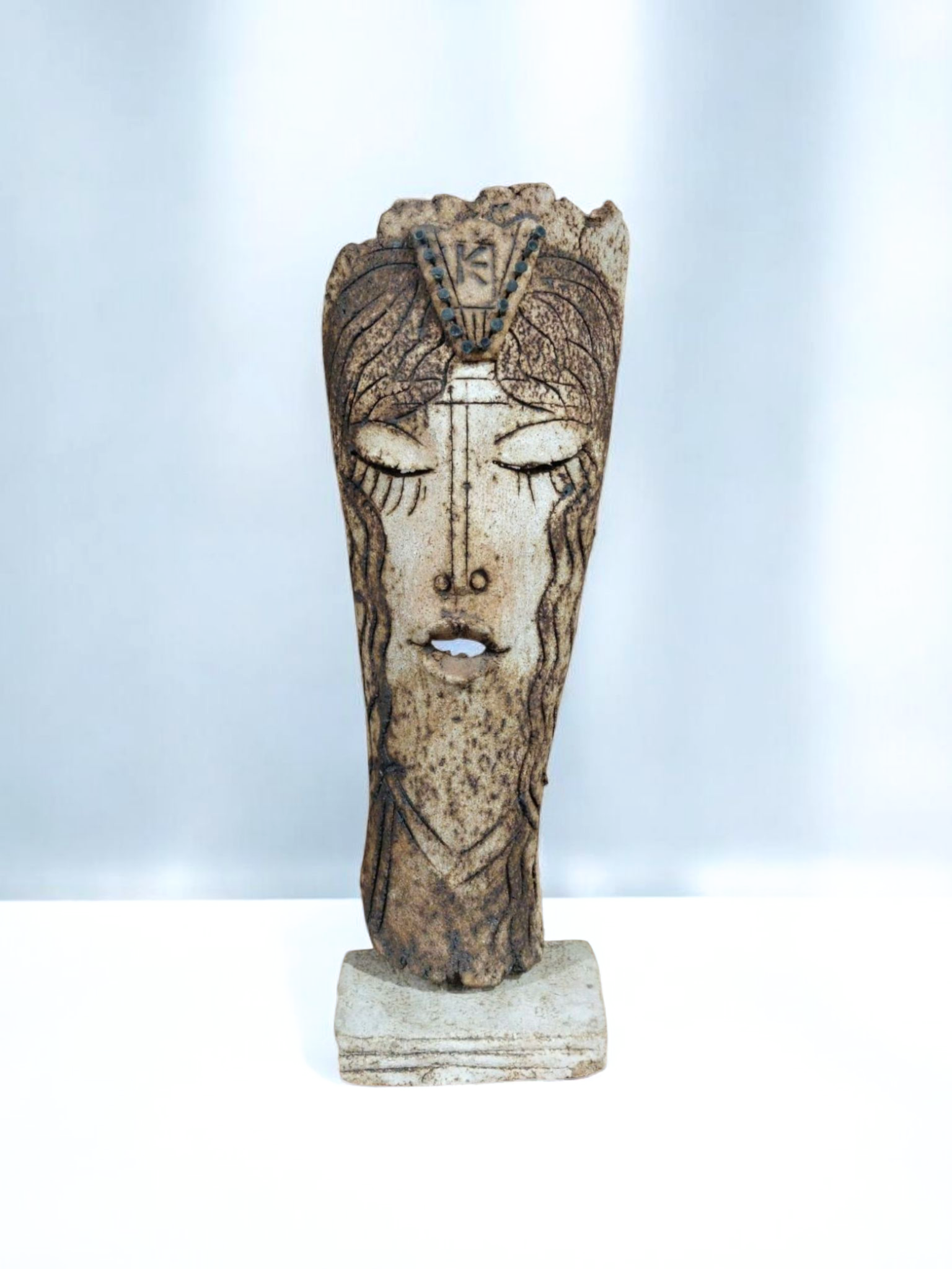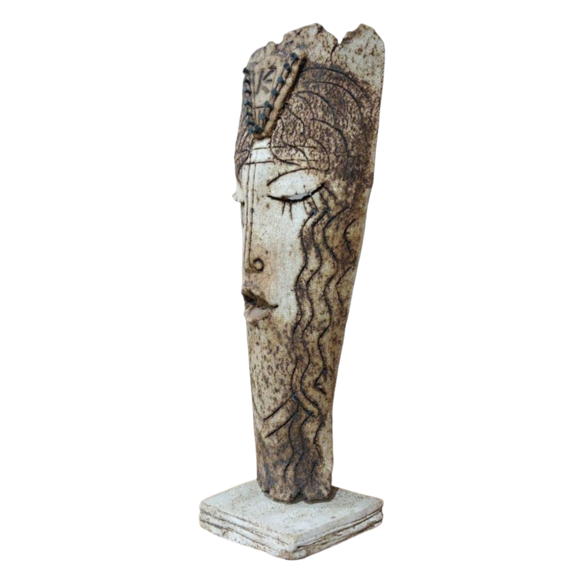 - This ‘Ancestral Godess Ceramic Sculpture’ features a calm,closed-eye expression that evokes feminine wisdom and ancient ritual presence.Every detail is shaped from clay,including the small ceramic nail elements that accent the surface-creating a fully unified ceramic artwork.