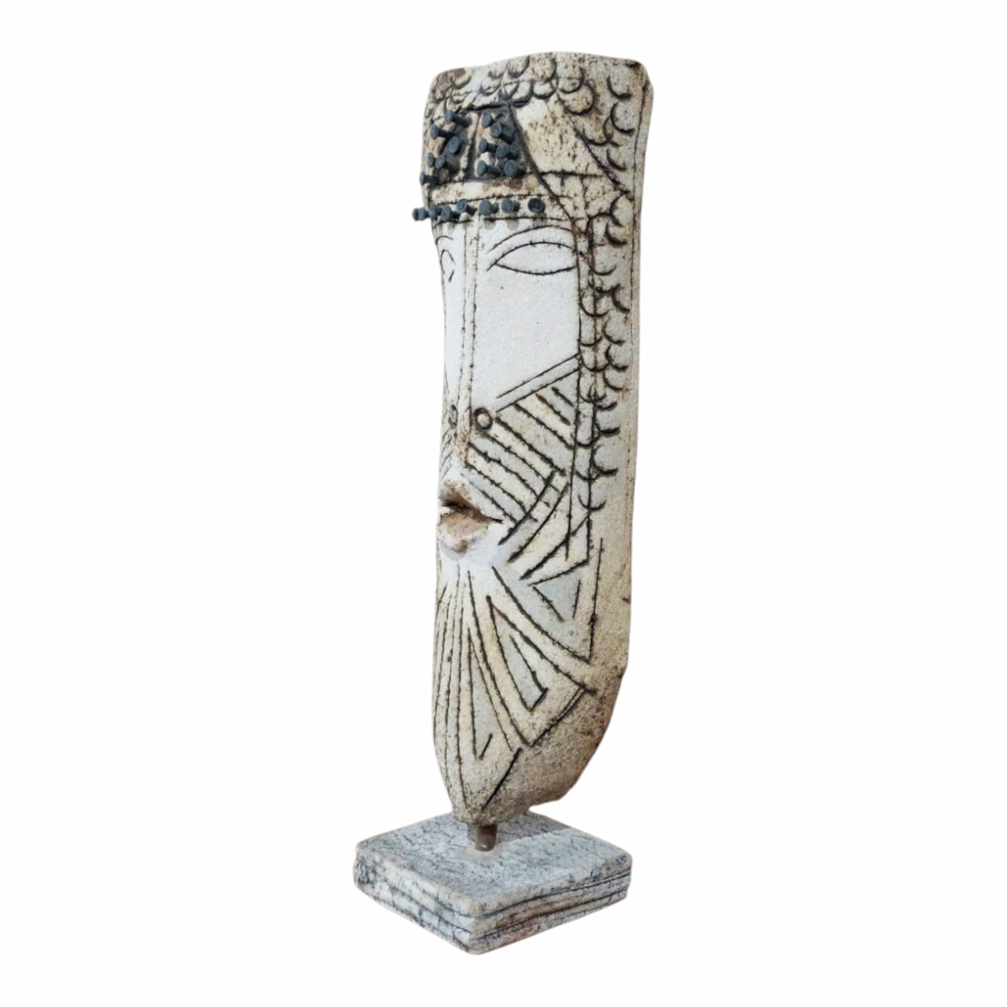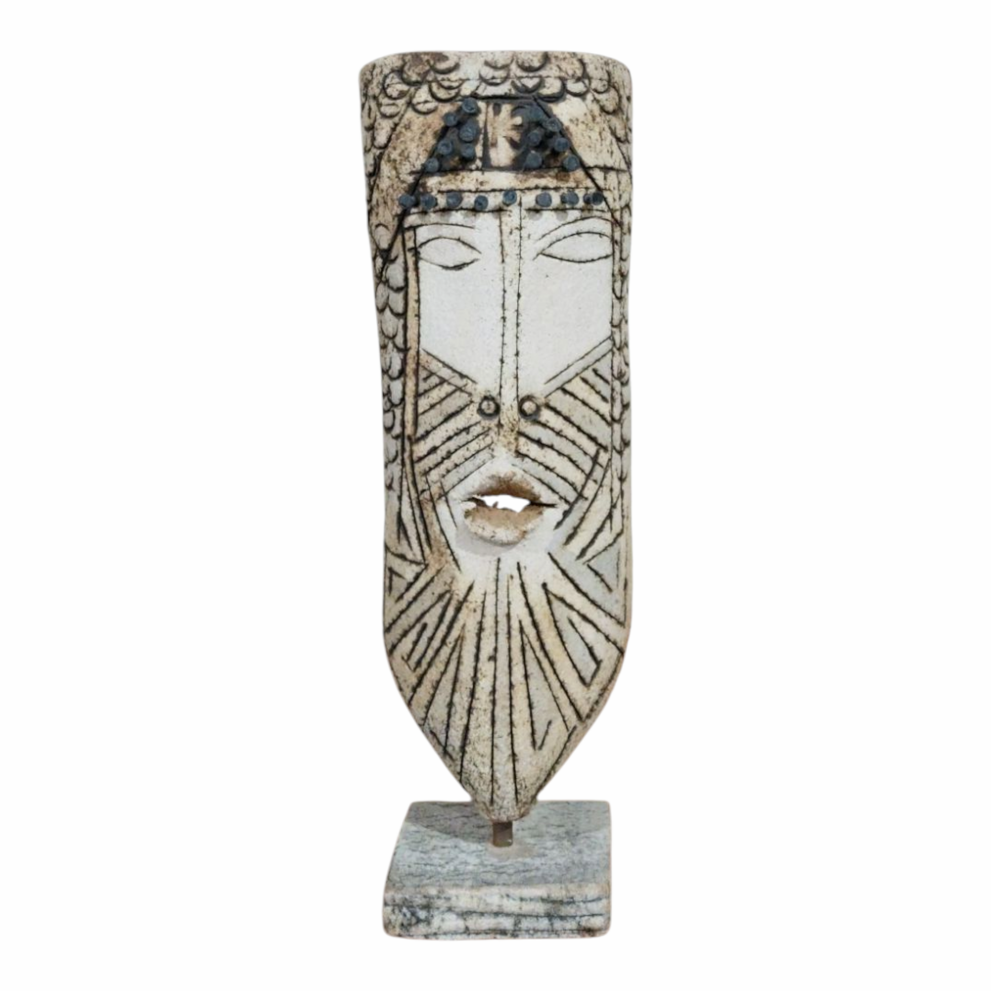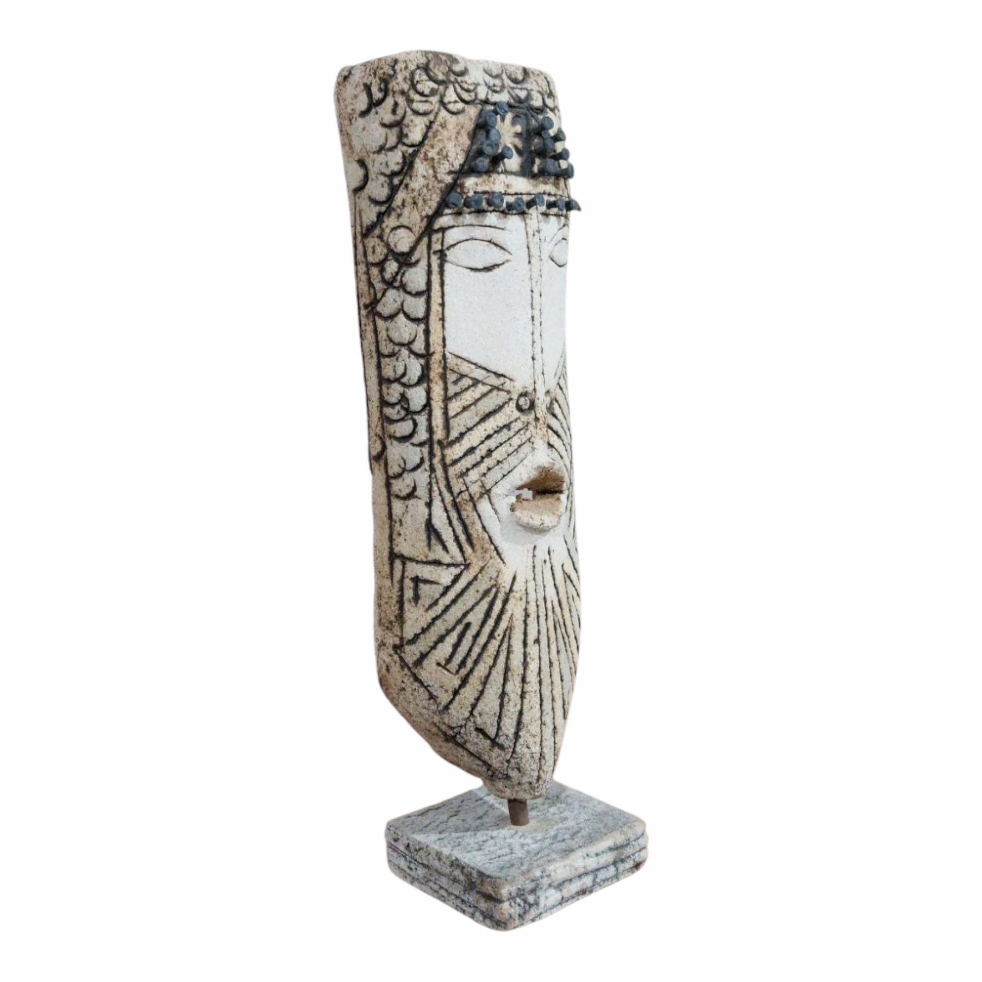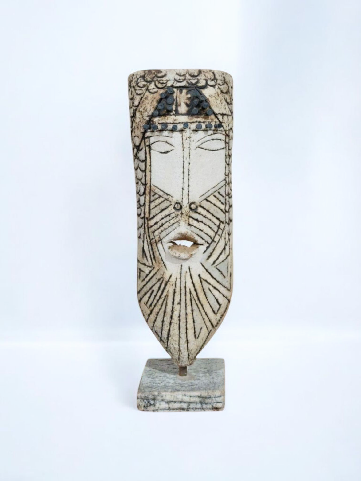 - This handmade ‘Ceramic Warrior Face of Ancestral Echoes’ features intricate etched patterns and a serene,timeless expression.Every detail,including the decorative nail-like elements is crafted entirely from clay.