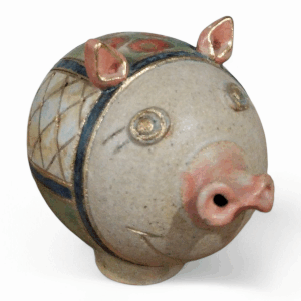 - Bring a touch of artistry to your space with the Geometric Bloom Piglet,handcrafted ceramic pig sculpture,featuring abstract geometric patterns along its sides in harmonious earthy tones.Delicate red floral accents with golden details adorn its back,adding elegance and artistic charm.