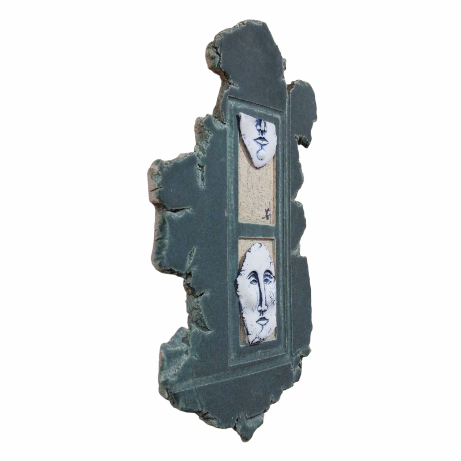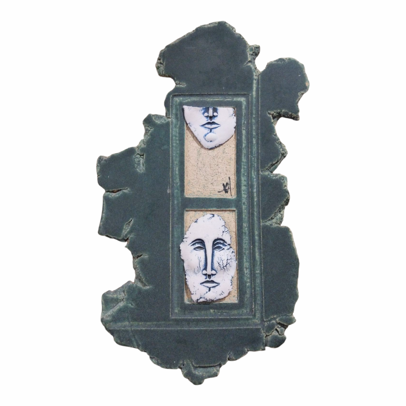 - “Green Dialogue” is a handmade is a handmade ceramic wall sculpture featuring green glazing and a window that frames two delicate porcelain faces.