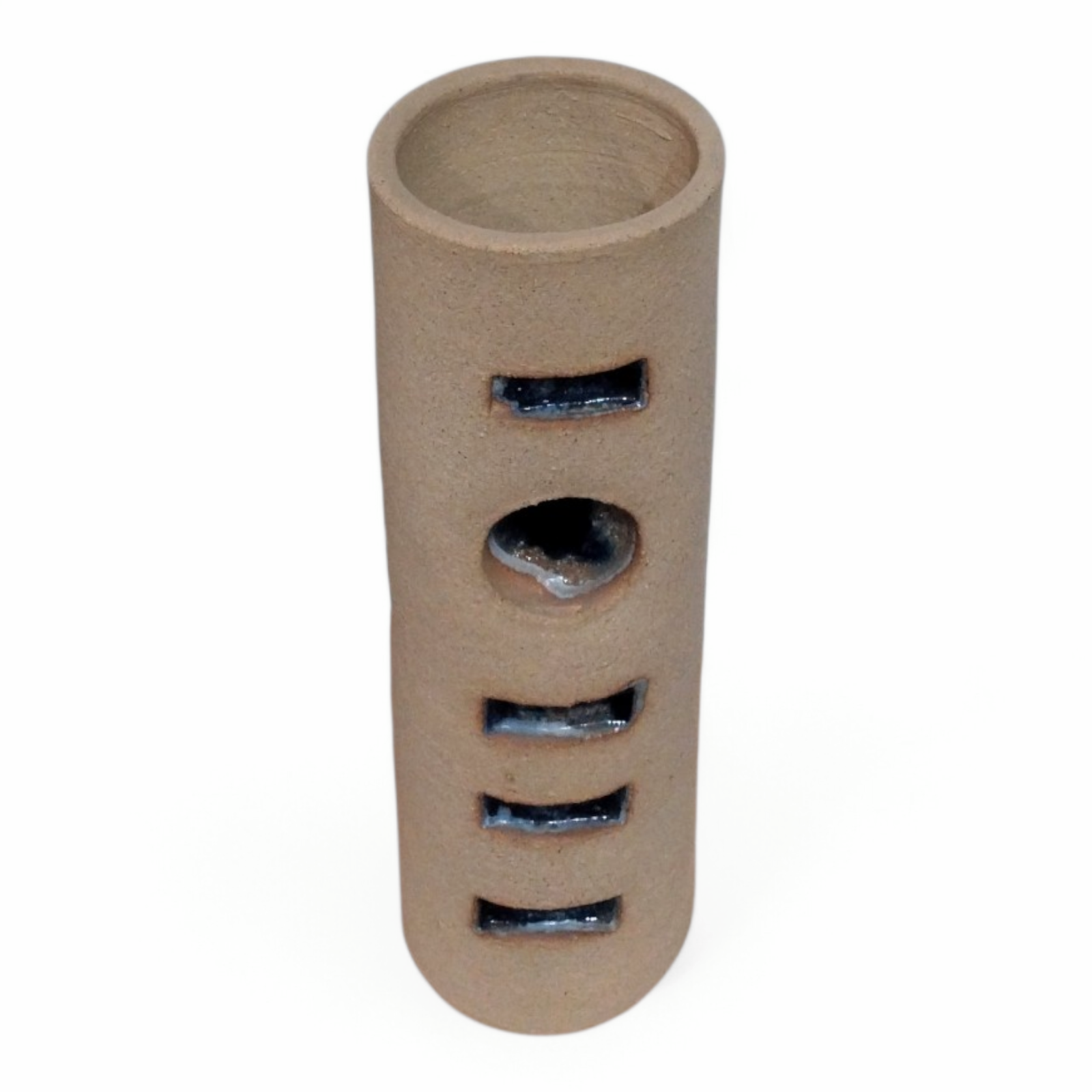 • Handmade cylindrical ceramic vase with a raw,rough surface in natural sand tones.The front features cut-out openings filled with deep blue glass,creating a striking contrast with the earthy exterior.