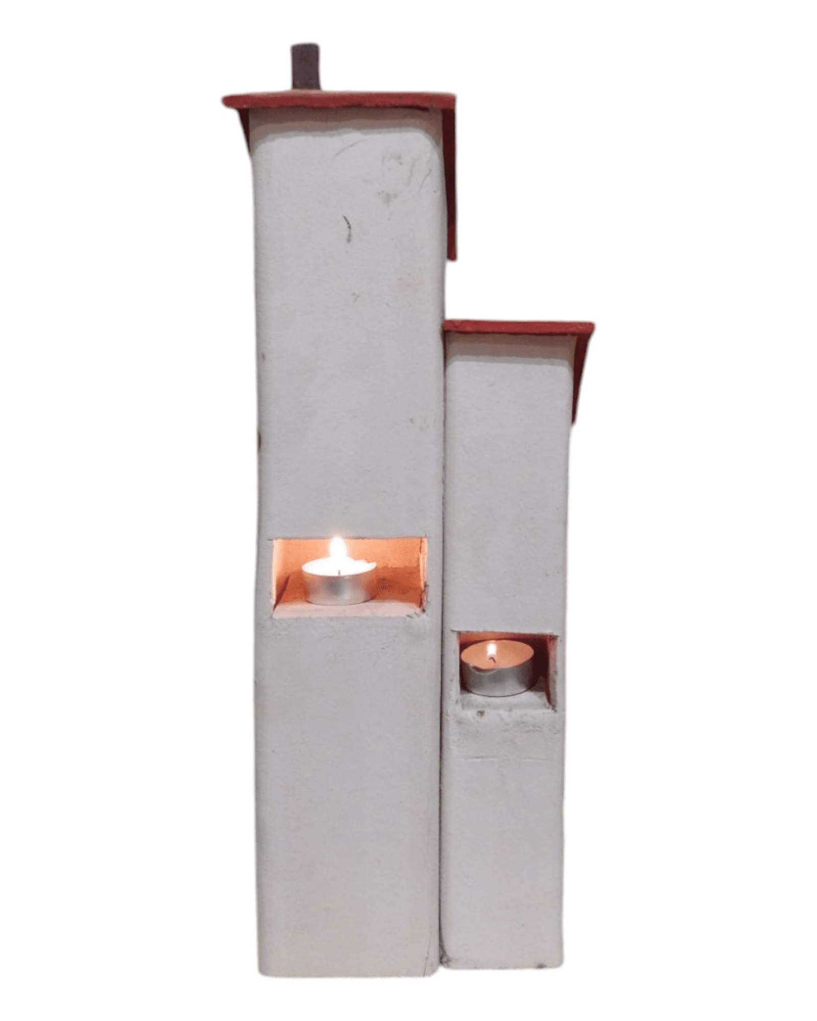 - Designed to softly illuminate its surroundings,it holds four tealight candles-two placed on the central level and two on the lower base-allowing light to glow gently through its openings.