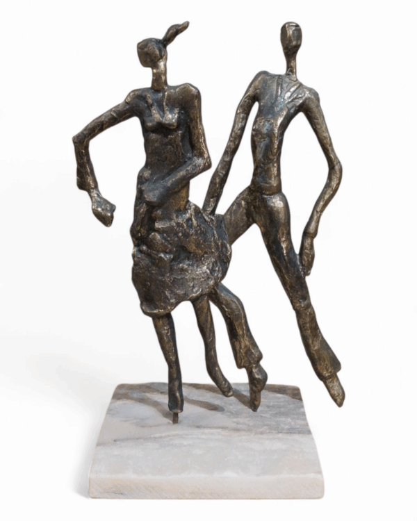 - This abstract bronze sculpture captures a Latin dance couple in a moment of shared movement and rhythm.The dynamic poses suggest connection,balance,and flowing motion,expressed through elongated forms and textured surfaces.
