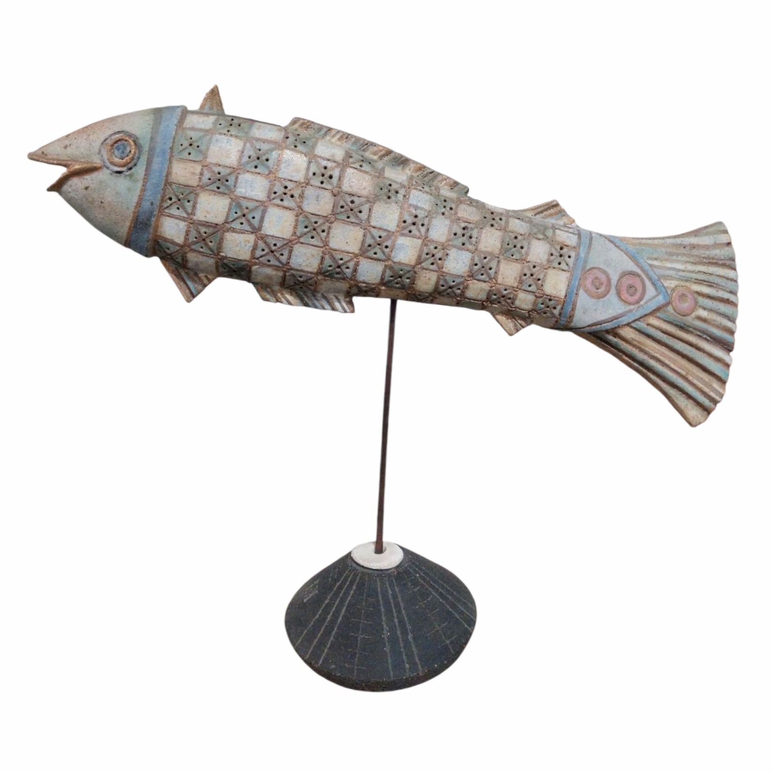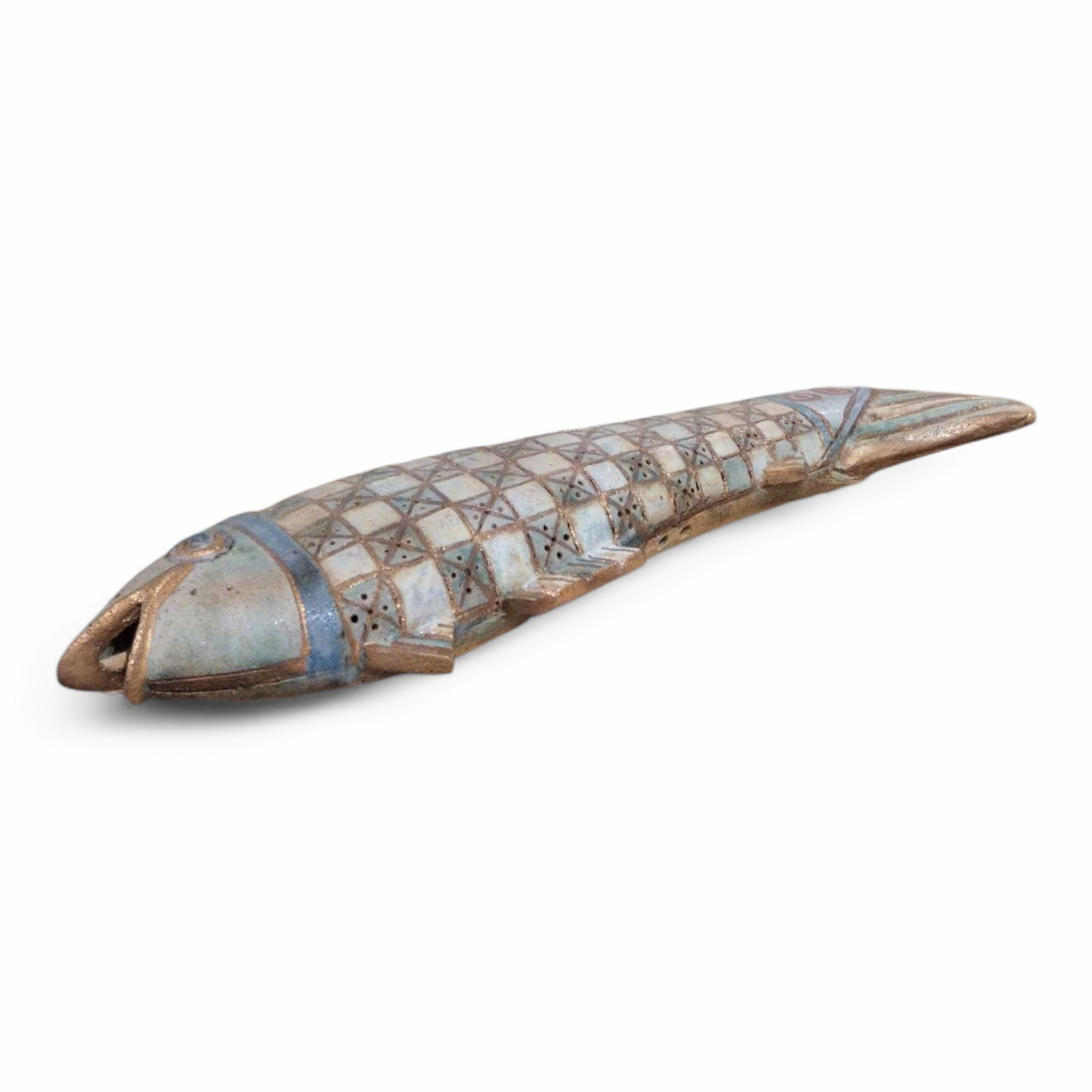 - This handcrafted ceramic fish rests gracefully on a ceramic base,painted in earthy tones and adorned with geometric mosaic patterns.Its harmonious design adds a subtle touch of sophistication,making it a perfect centerpiece or decorative accent that evokes the quiet beauty of the sea.