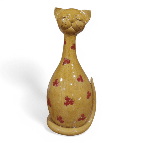 - ‘Golden Calm’ is a handmade mustard ceramic cat sculpture with a glossy finish and softly rounded,flowing curves.The warm mustard glaze is gently accented with small red floral details,adding a subtle decorative contrast and a sense of warmth.