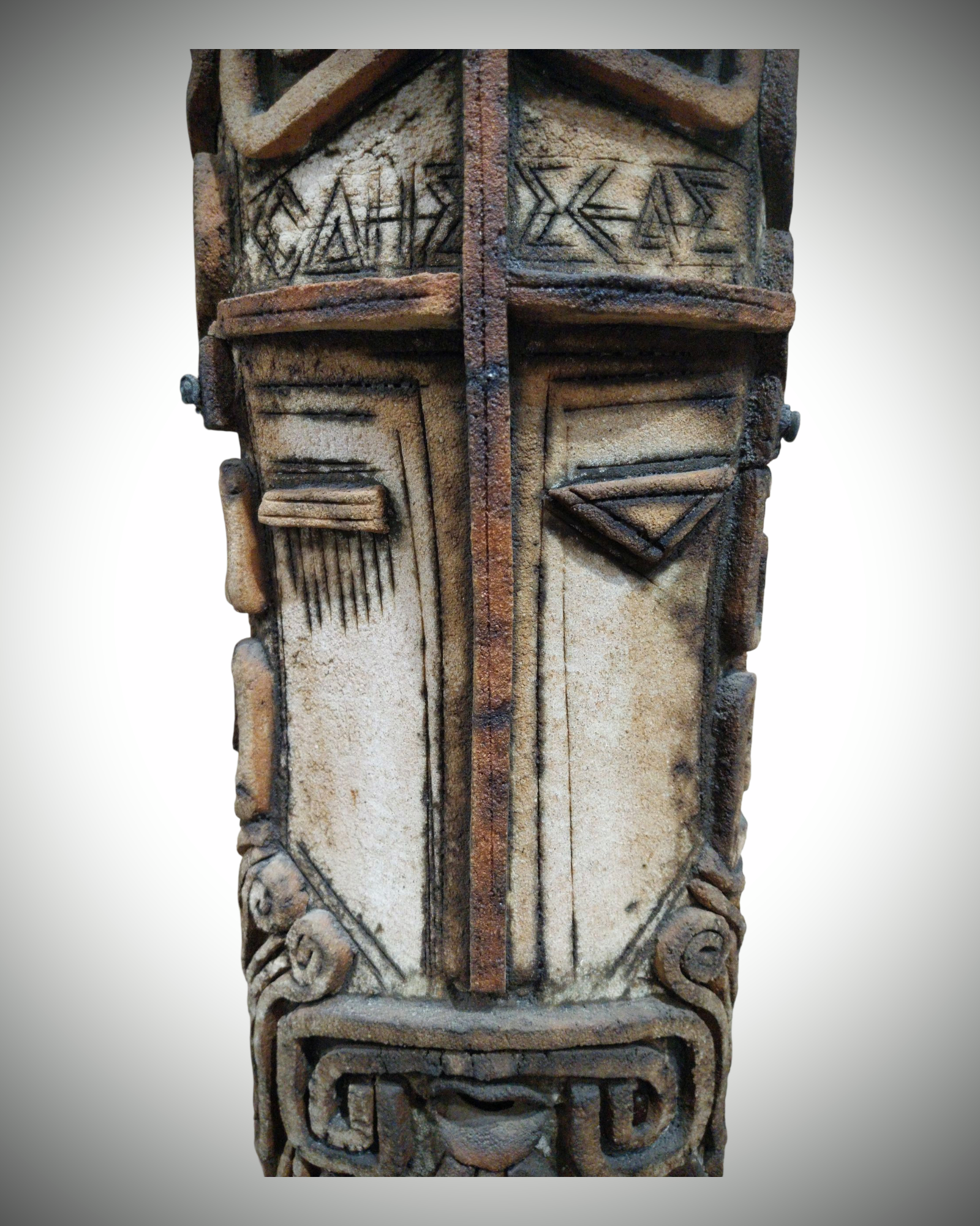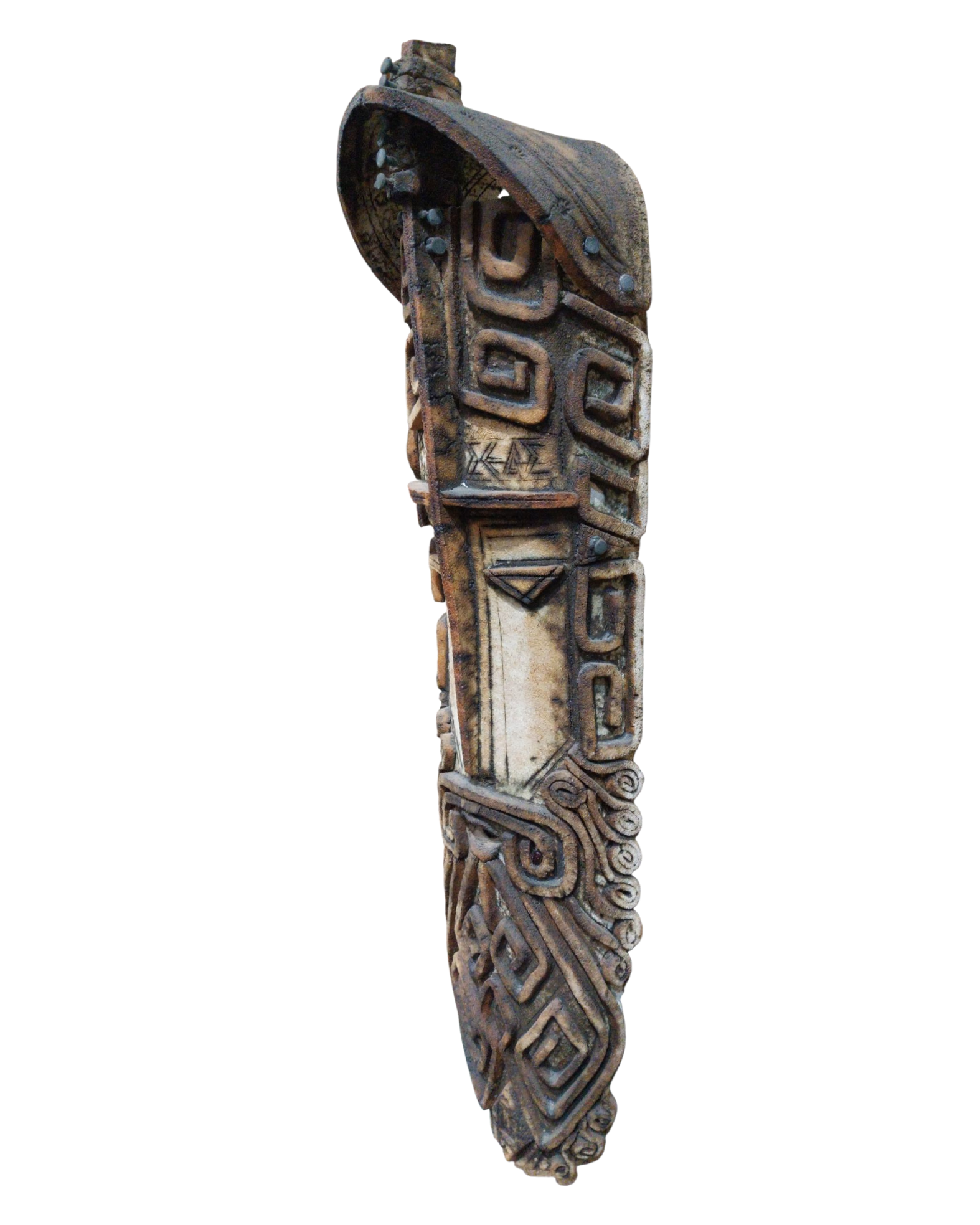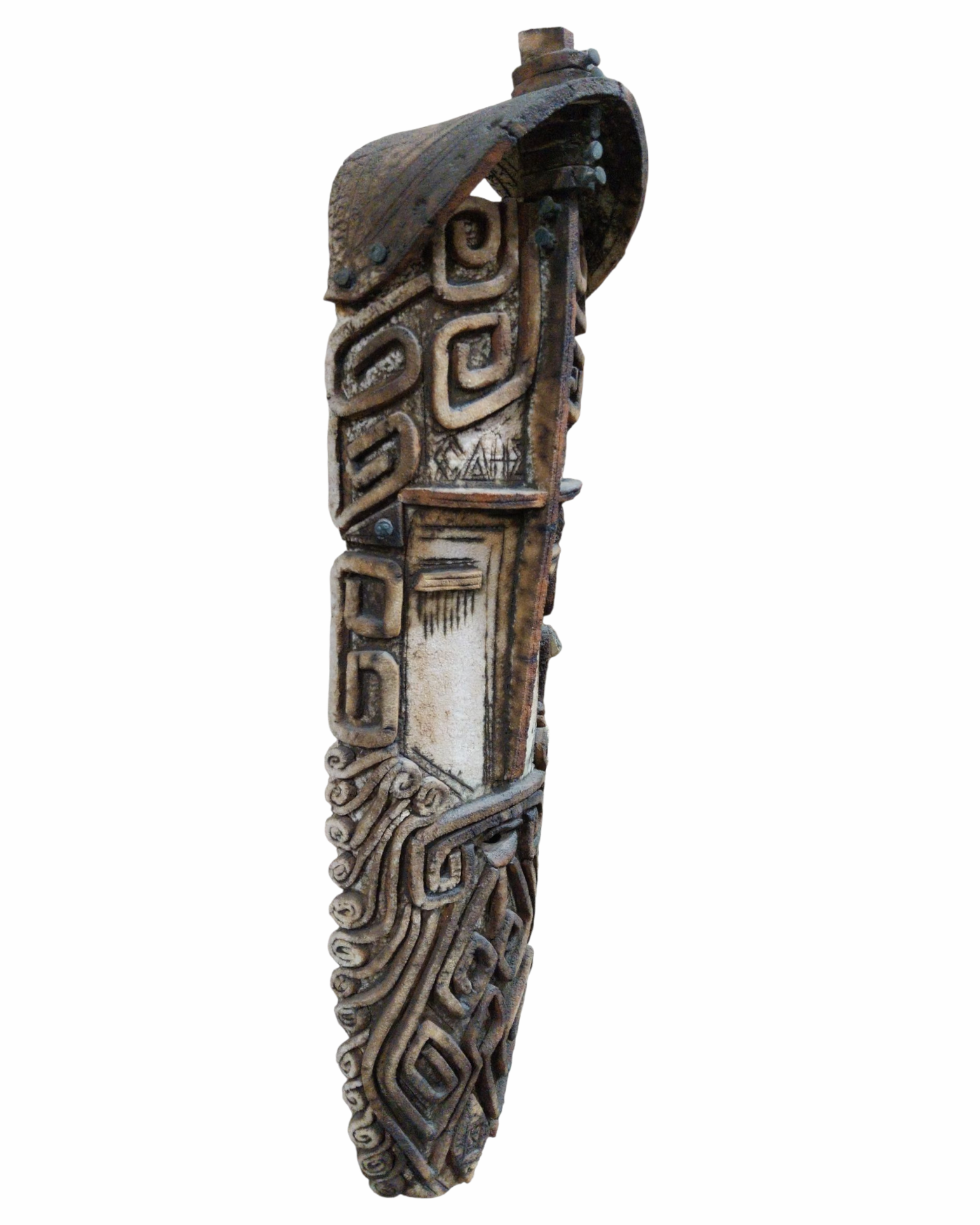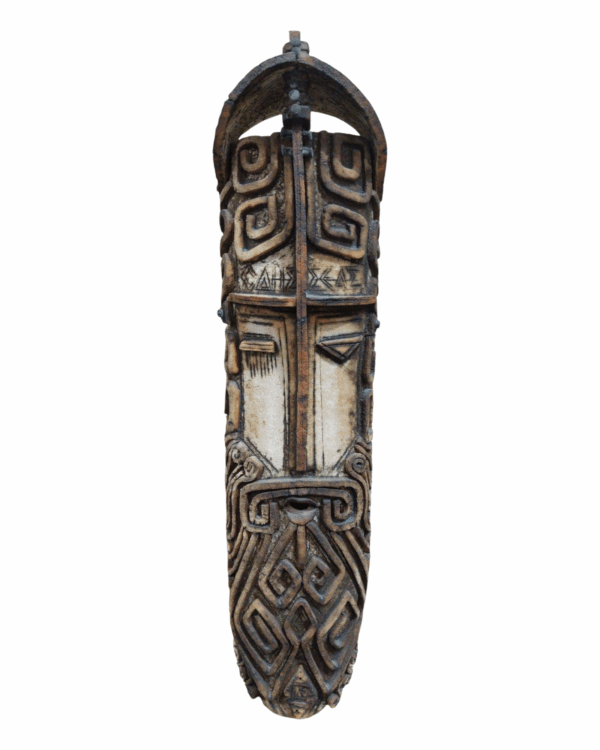 Handcrafted-style wall mask with tribal geometric carvings in earthy brown tones. A striking vertical decor piece for boho, rustic, and eclectic interiors.