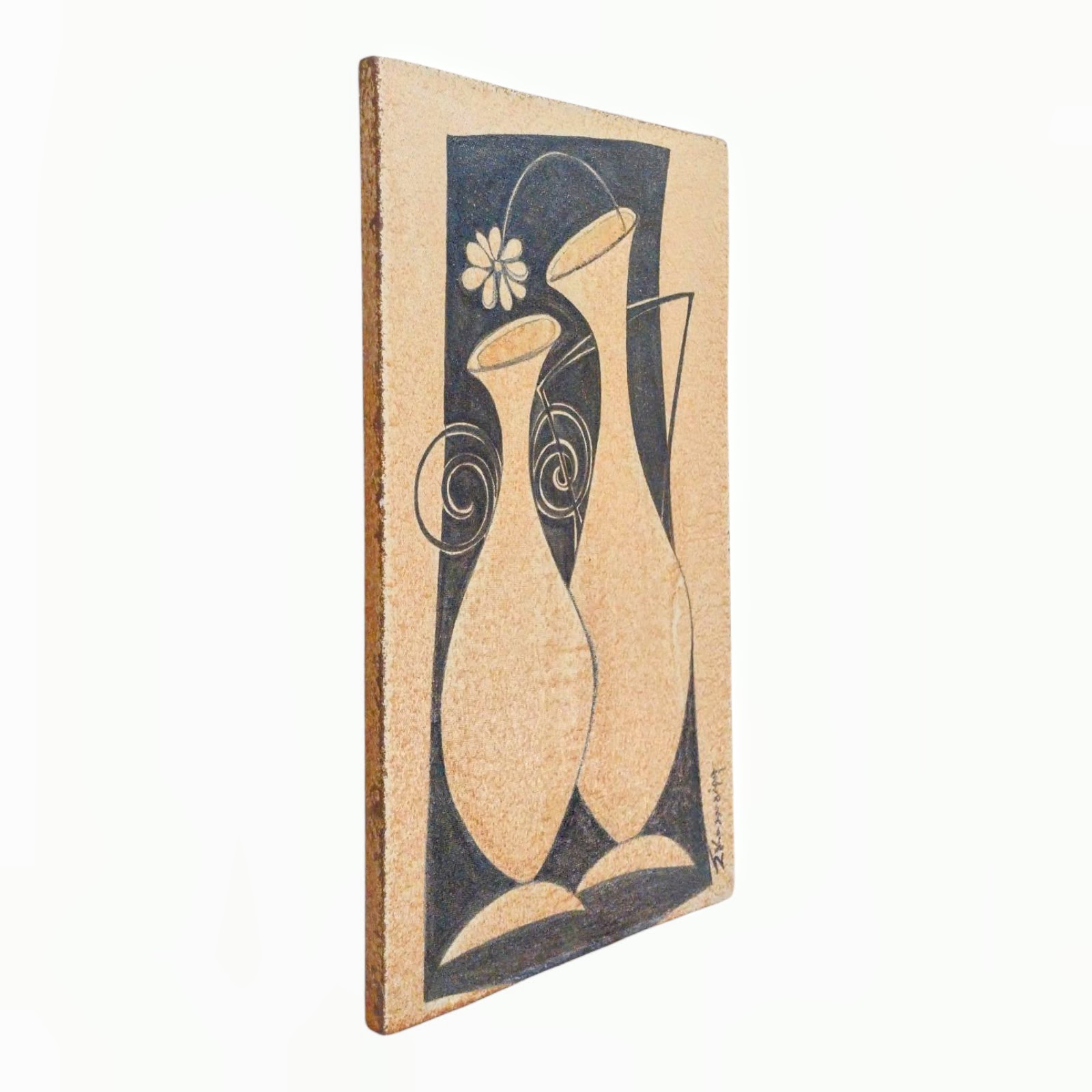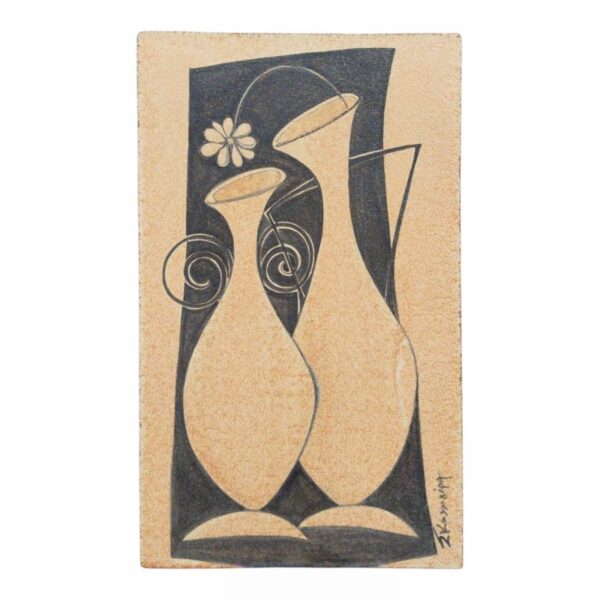 - This hand-crafted ceramic wall art features two connected vases painted in soft brown tones against a striking black backround.