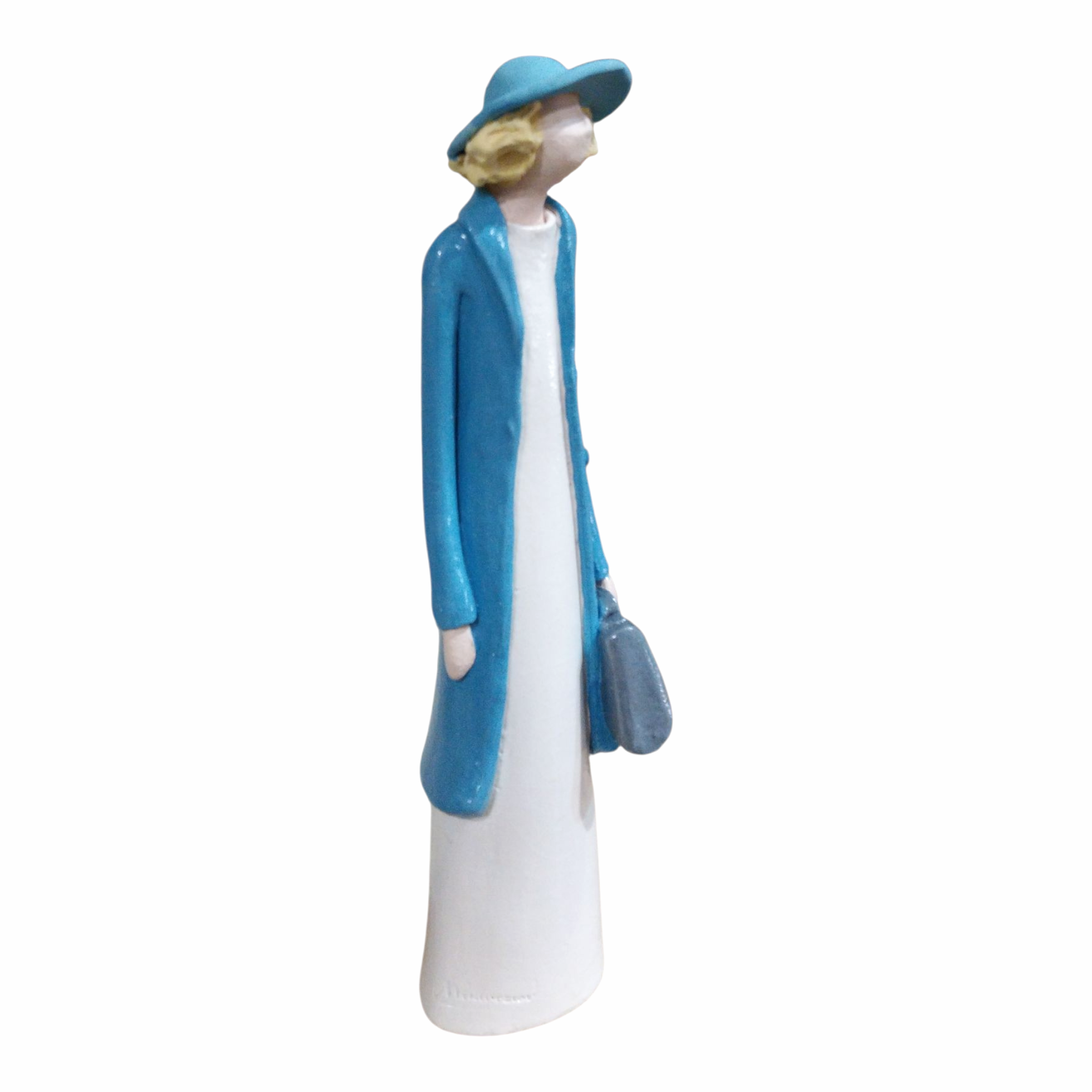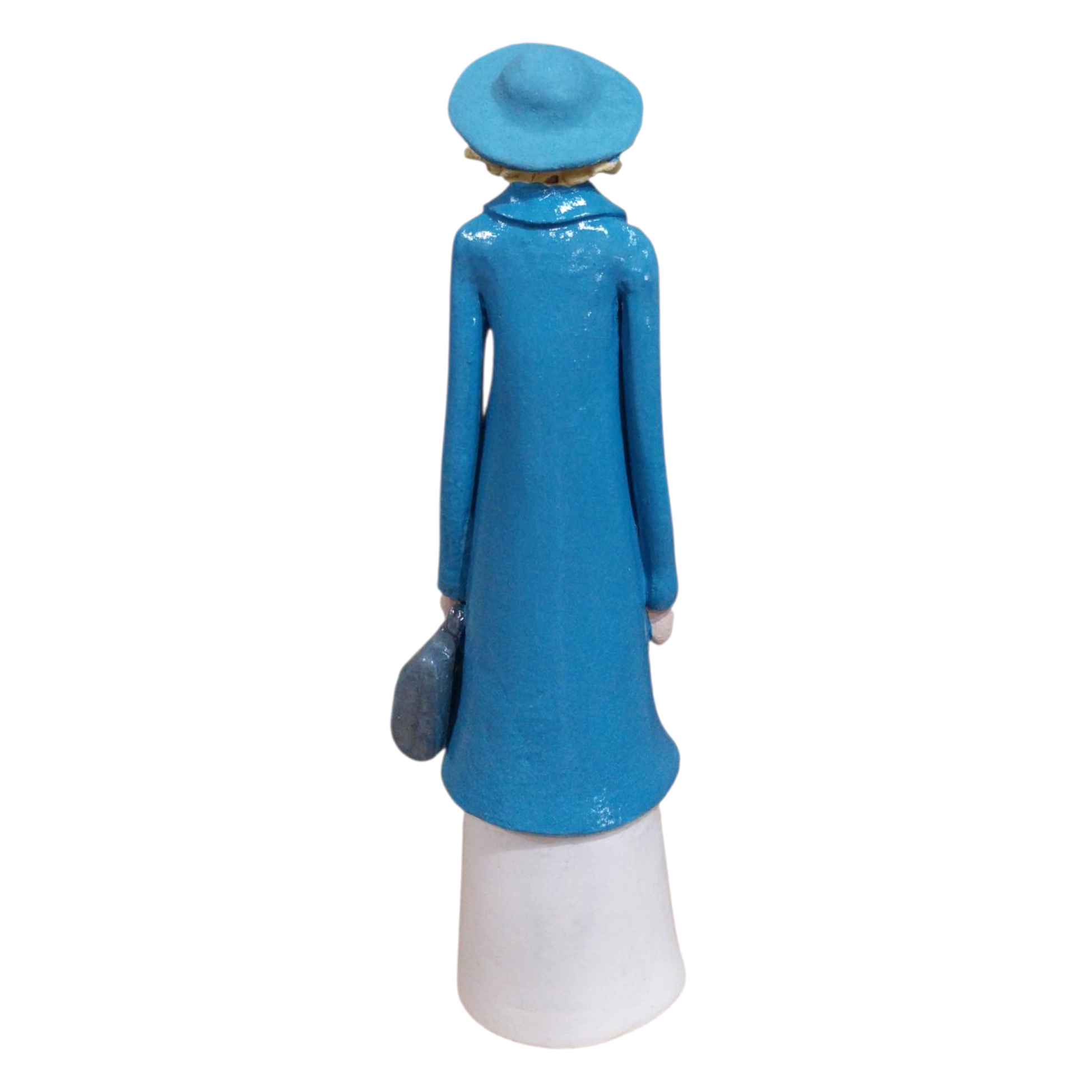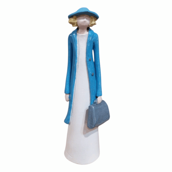• Bring a touch of elegance to your space with the ‘Glossy Lady in Motion’.This handcrafted ceramic woman figurine features a polished finish,a stylish blue coat,white dress,and a sleek gry bag.