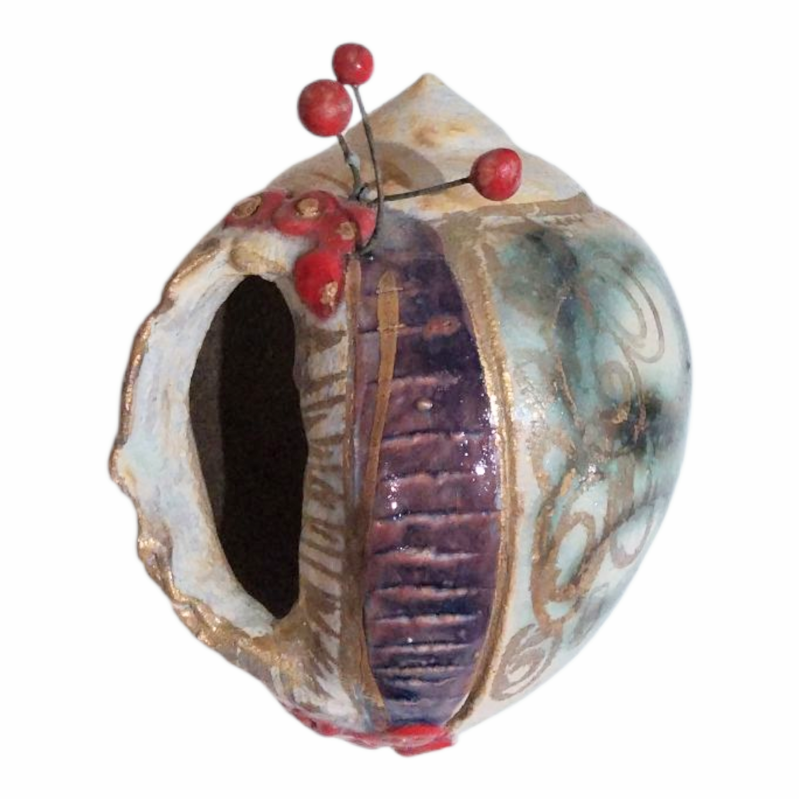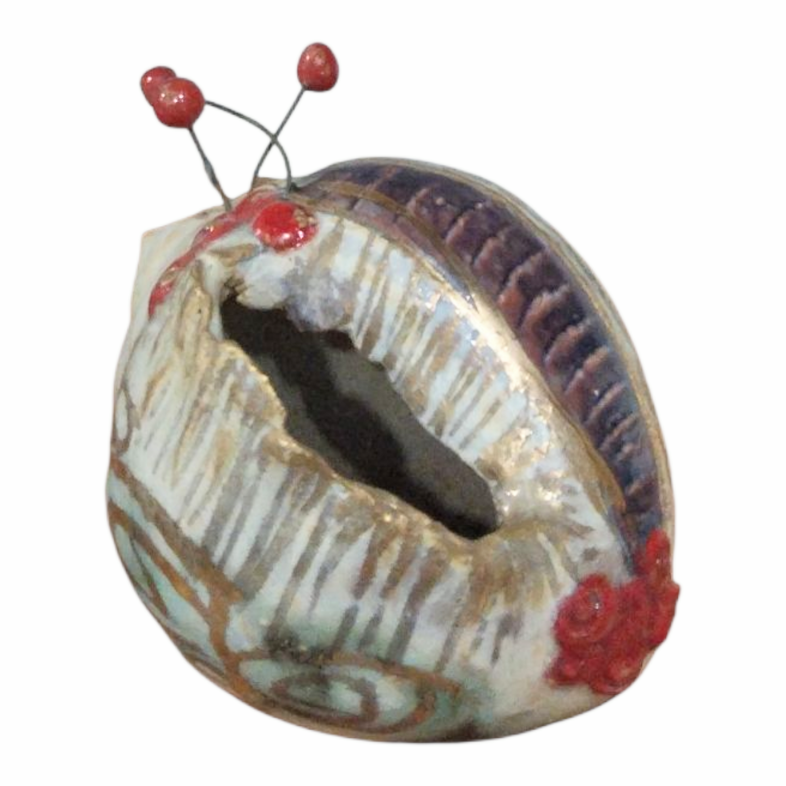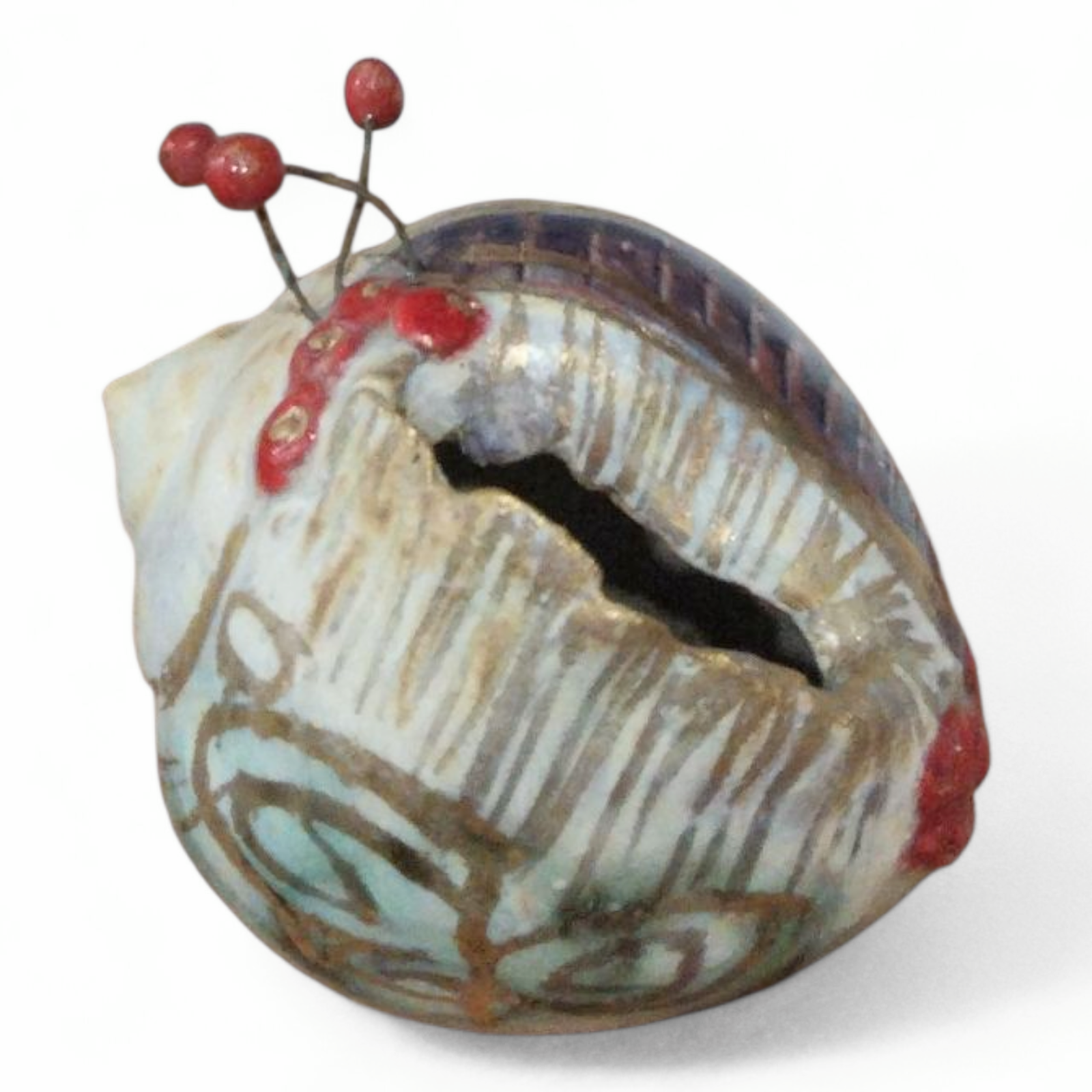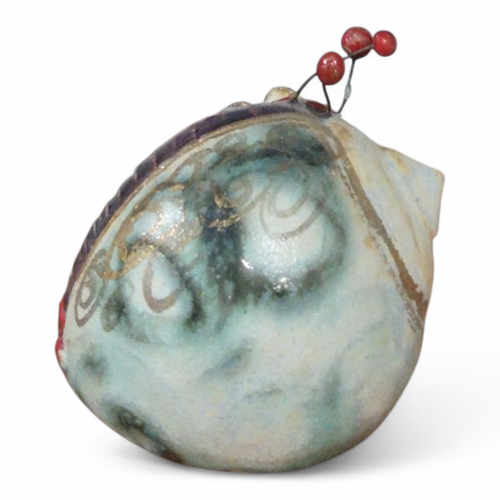 - A delicate ceramic shell inspired by the ocean,featuring soft curves,circular and linear patterns,and numerous shimmering golden accents.