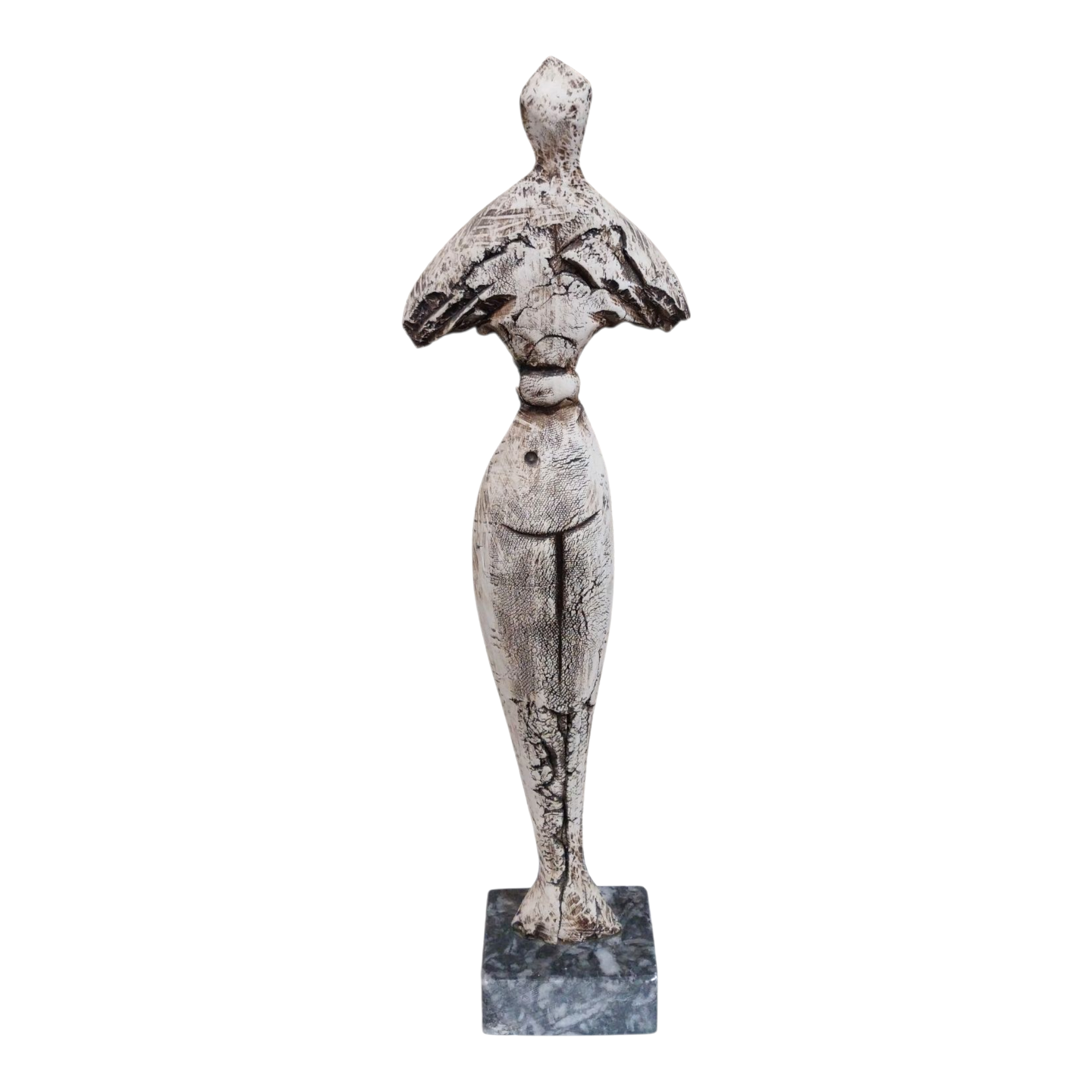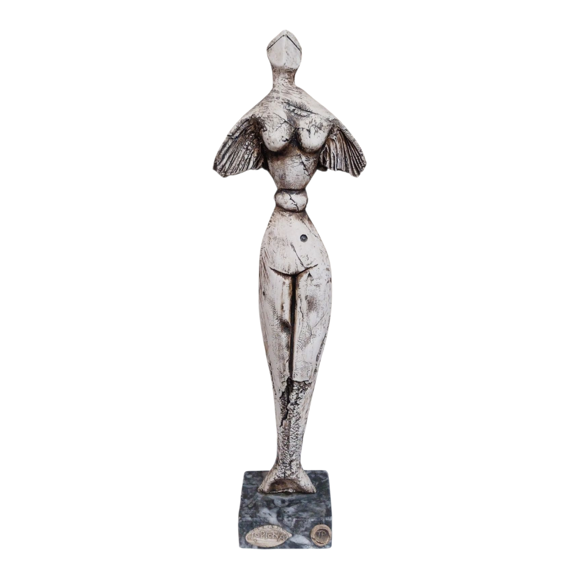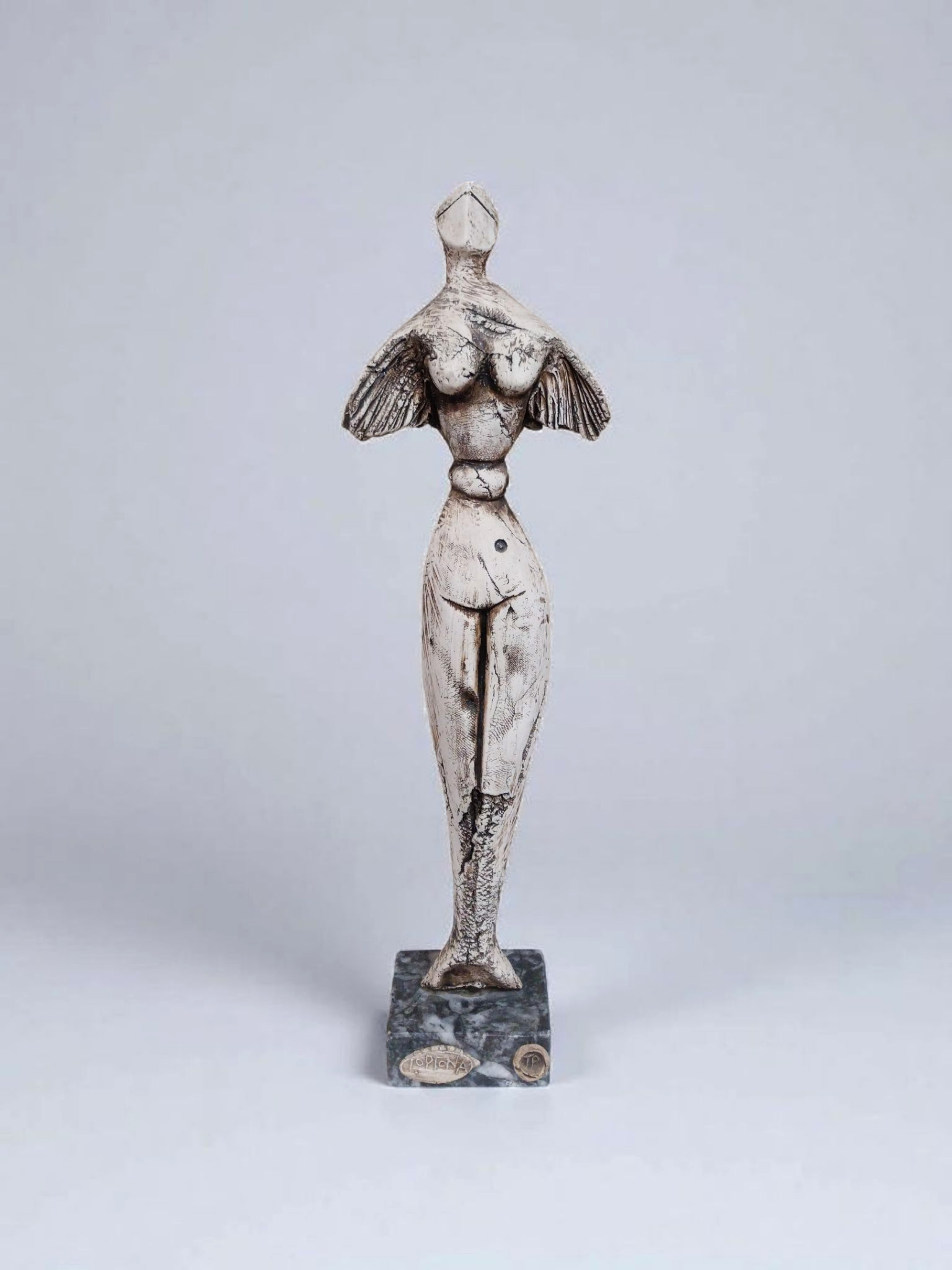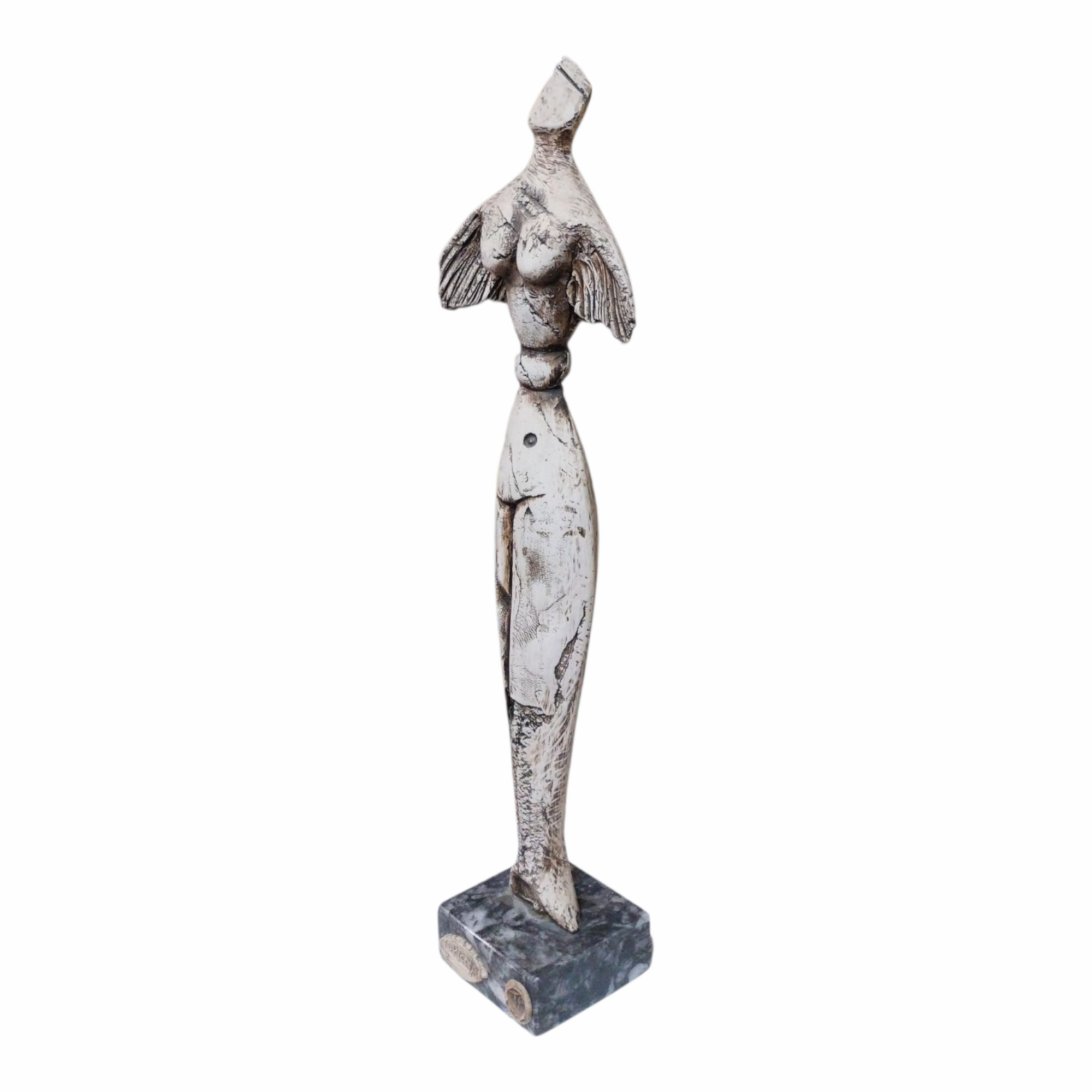 - ‘The Voice of the Sea’ is a handcrafted ceramic mermaid figure sculpture in warm earthy tones,gracefully positioned on a marble base.The figure features prominent engraved lines across its surface,adding texture and enhancing its flowing,natural form.