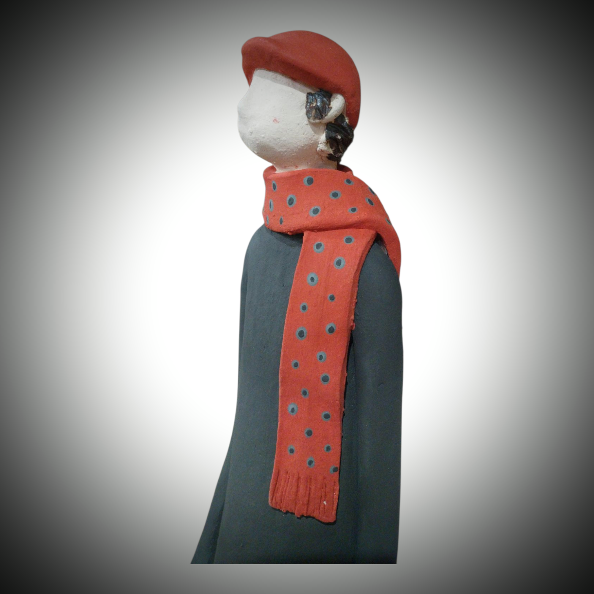 • This elegant ceramic figurine captures the charm of a modern gentleman.Dressed in shades of black and red,with a simple black handbag,a stylish scarf,and carved vertical lines on his pants,he exudes understated sophistication and timeless style.